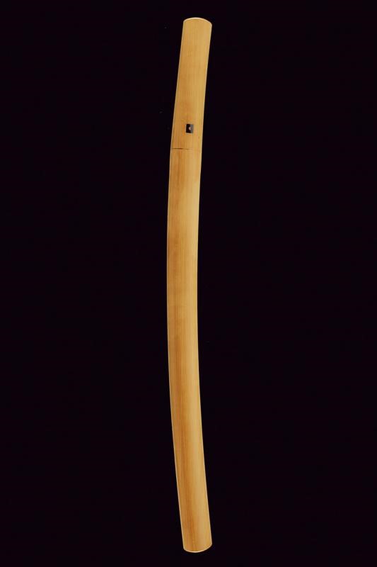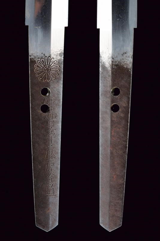 Shinogi-zukuri blade, Iori-mune. Nagasa: 48.7 cm. Hamon: Gunome-midare, visible Hada. Nakago-jiri: Kengyo-jiri. Mei: Iga no Kami Kinmichi, with Kikumon. Two Mekugi-ana. Shinto era. Two-layer Habaki made of finished and gilded metal. In Shirasaya.