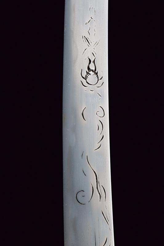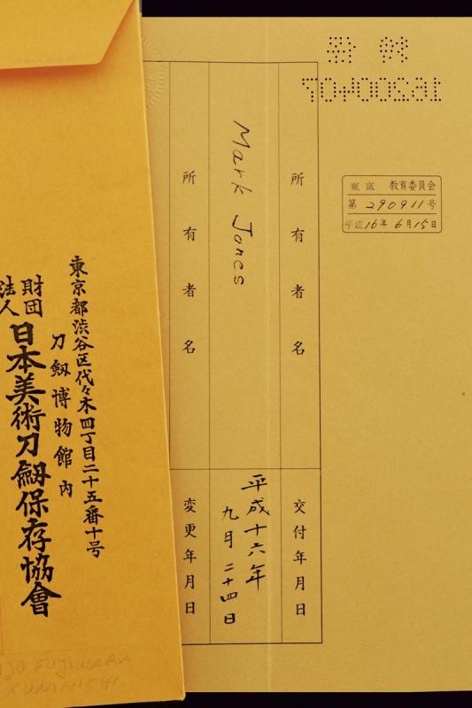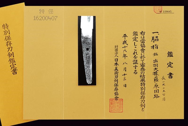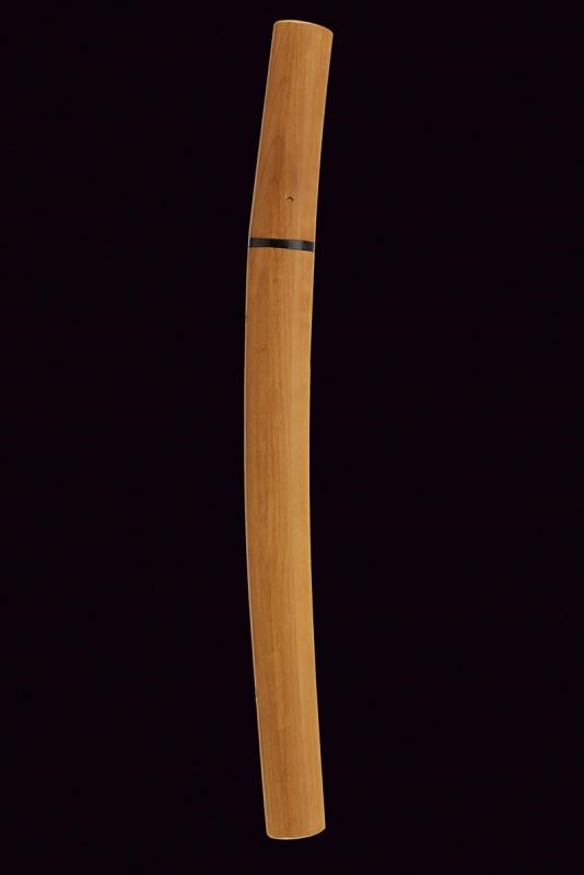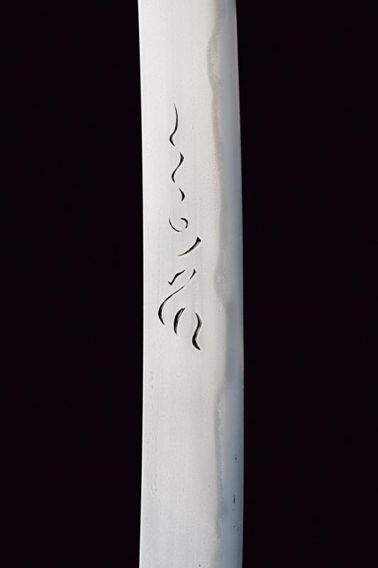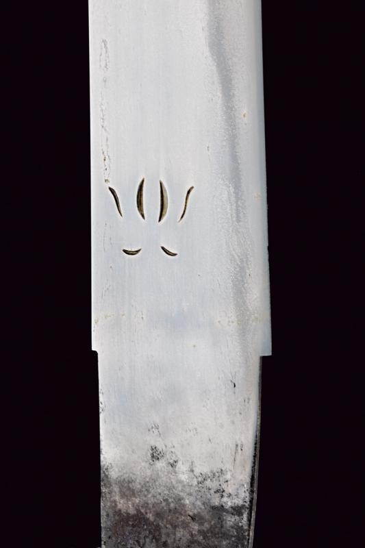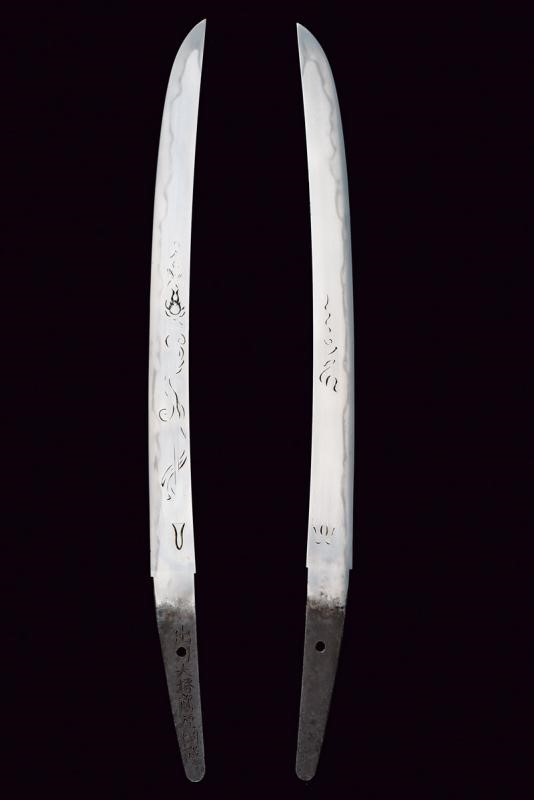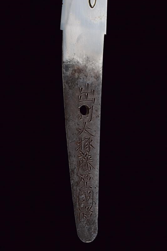 Hira-zukuri blade, Iori-mune. Nagasa: 33 cm. Visible hamon and hada. Remains of Horimono on both sides. Nakago-jiri: Kurijiri. Mei: Dewa Daijo Fujiwara Kunimichi. One Mekugi-ana. Habaki made of silver-coloured metal with two brass foils. In Shirasaya.