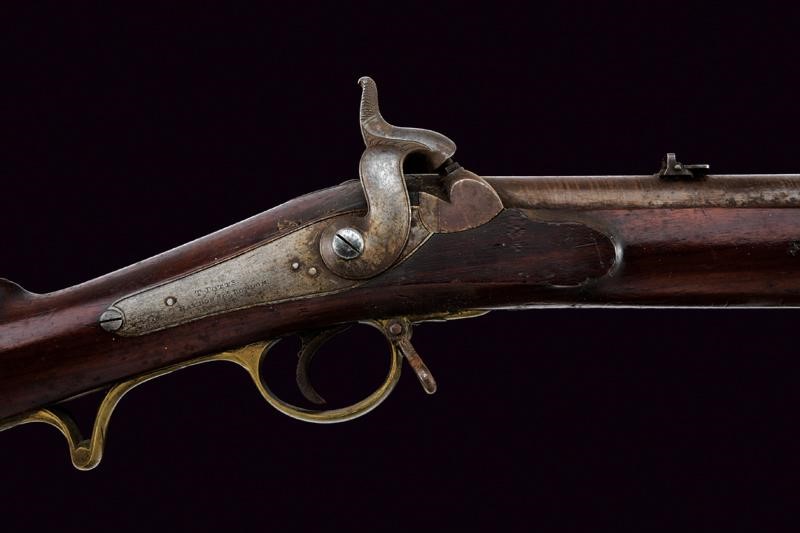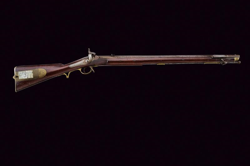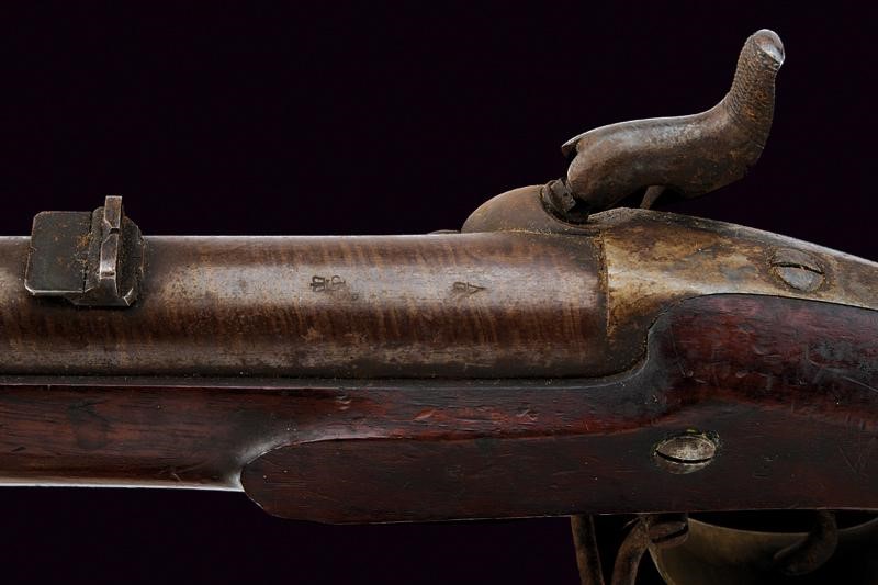 Round, damascened, 18 mm cal. barrel, with well marked rifling, provided with foresight, rear sight with two sight leaf, one of which is foldaway, with marks of the London test bench at the base. Backward spring lock outlined on the border and signed "T. POTTS HAYDON SQ.R LONDON". Two-snap working mechanism. Wooden, full stock with some pitting. Brass mounts. Large patchbox with brass lid. Iron ramrod. Club guide for the bayonet. Rare.