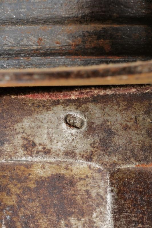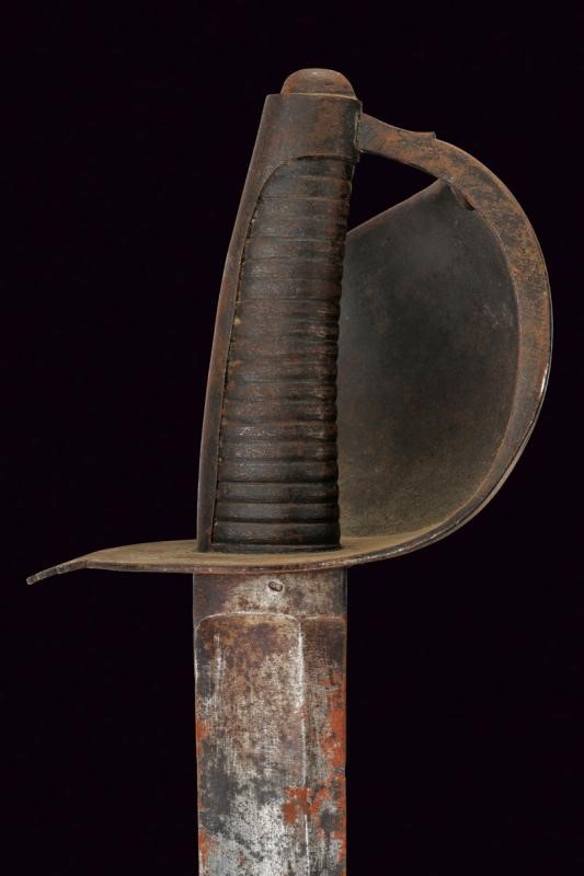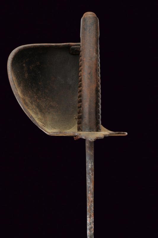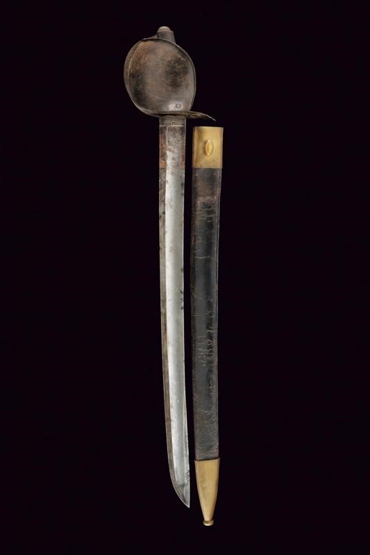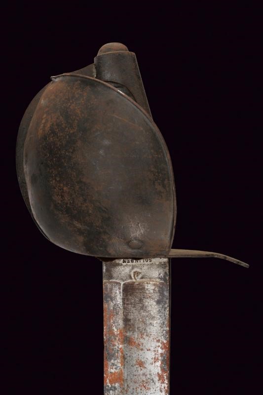 Large, slightly curved, single-and-false-edged blade (small pitting) with wide fuller, 'SOLINGEN' marking and 'BD' mark. Bituminous, iron hilt with wide, smooth guard; iron grip with remains of black covering and long, smooth cap. Complete with leather scabbard with brass mounts ('BD' mark).