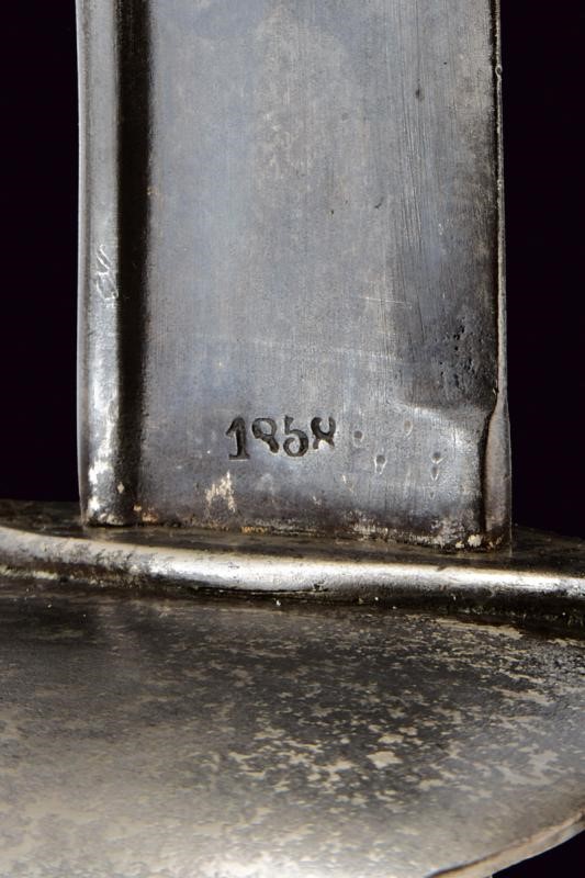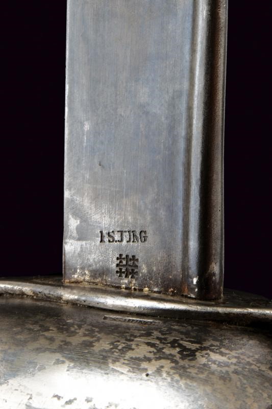 Large, single-edged blade (pitting) with thickened back, base dated '1858', marked 'F. S. JUNG' and with a mark. Iron hilt with two valves and three loop-guards, marked 'F. S. JUNG' and 'V'. Wooden grip covered with fish skin and brass wire binding. Leather-covered, wooden scabbard with iron mounts.