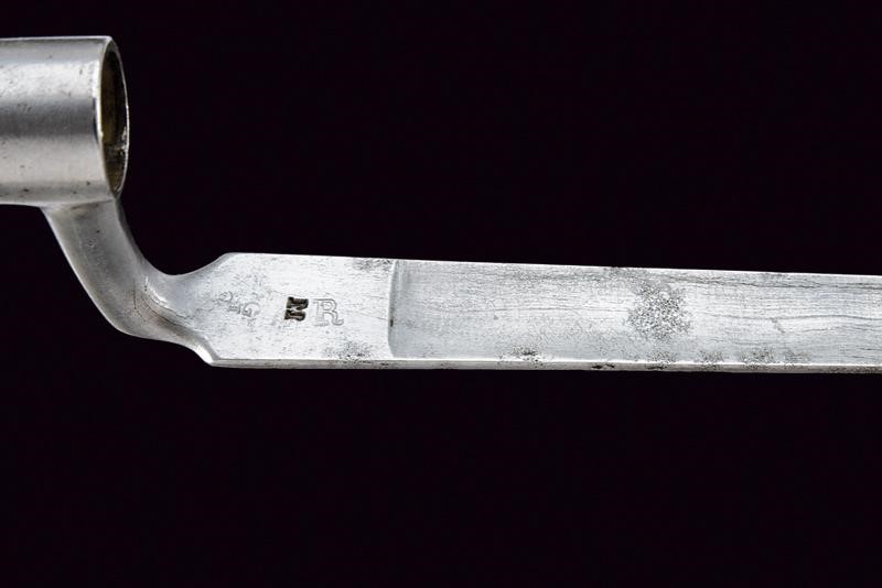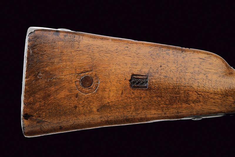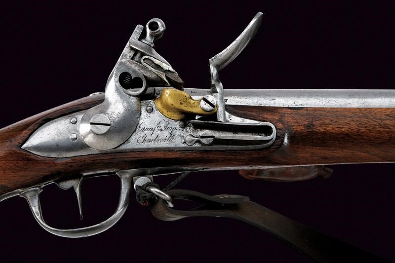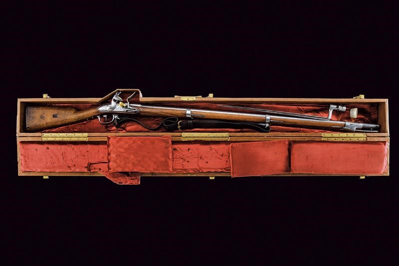 Smoothbore, round, 17,8 mm cal. barrel, marked at the base with various marks including "P" and "D" under crown and with date "1815", provided with clutch for the bayonet. Smooth tang engraved with "M.e 1777". Lock with barely legible mark and marked "Manuf.re Imp.le / de Charleville", brass pan. Walnut, full stock, on the butt Neuchatel Battalion 1804 mark on one side and red stamp on the other; iron mounts. Bands bearing remains of various marks, the one near the nozzle bearing a brass foresight. Iron ramrod. Socket bayonet bearing various marks (length 53 cm). Complete with strap and brown leather batterie cover. In wooden case covered in brown leather, the interior in soft red satin.