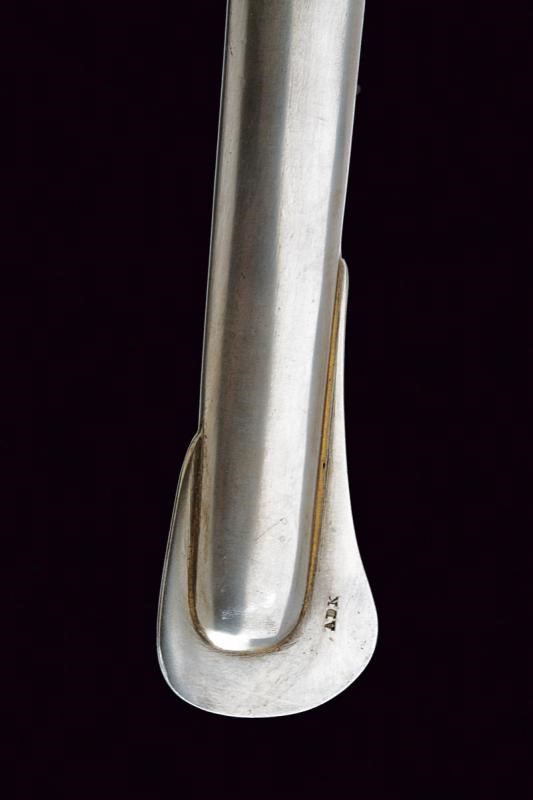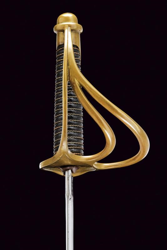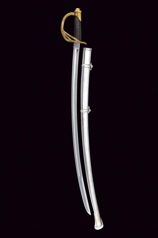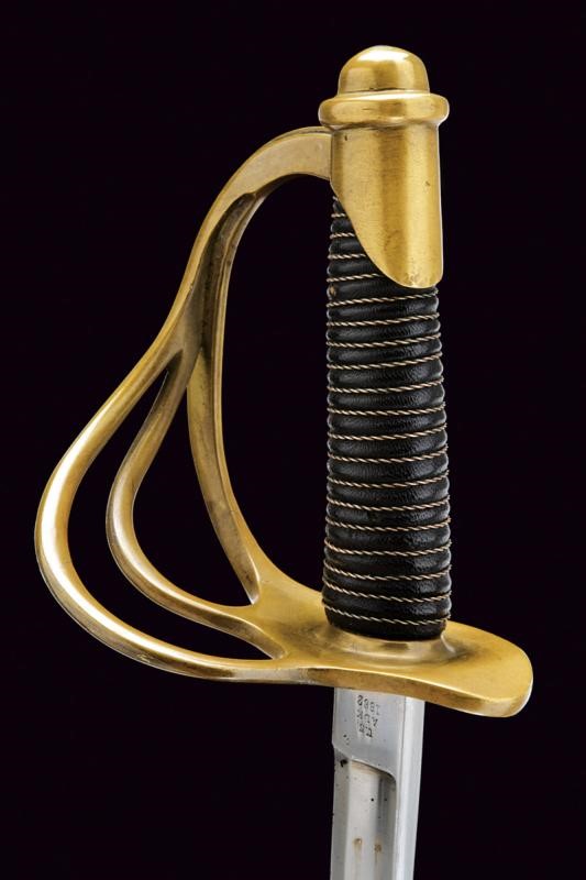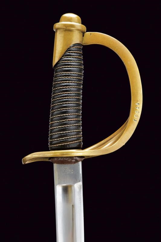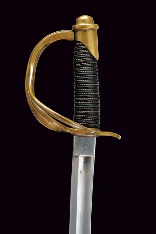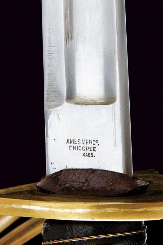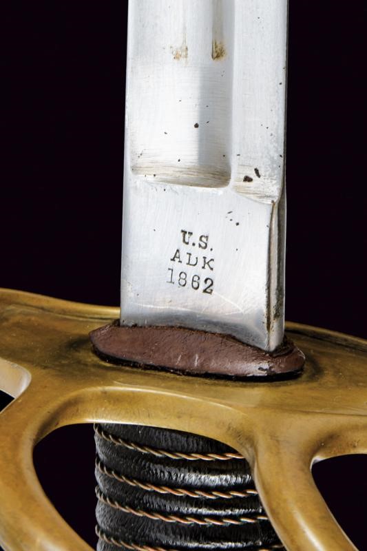 Long, curved, single-and-false-edged blade, with central fuller and back groove, the tang marked on the right side "U.S / ADK / 1862" and on the left side "AMES MFGC° / CHICOPEE / MASS.". Hilt with three loop-guard made of brass, with mark "11501" on the main one. Leather covered grip with copper wire binding. Complete with iron scabbard, two suspension rings.
