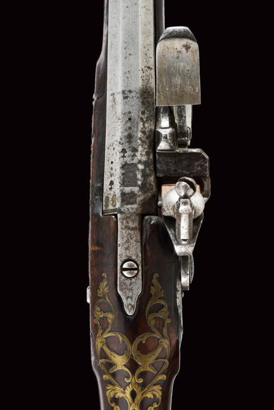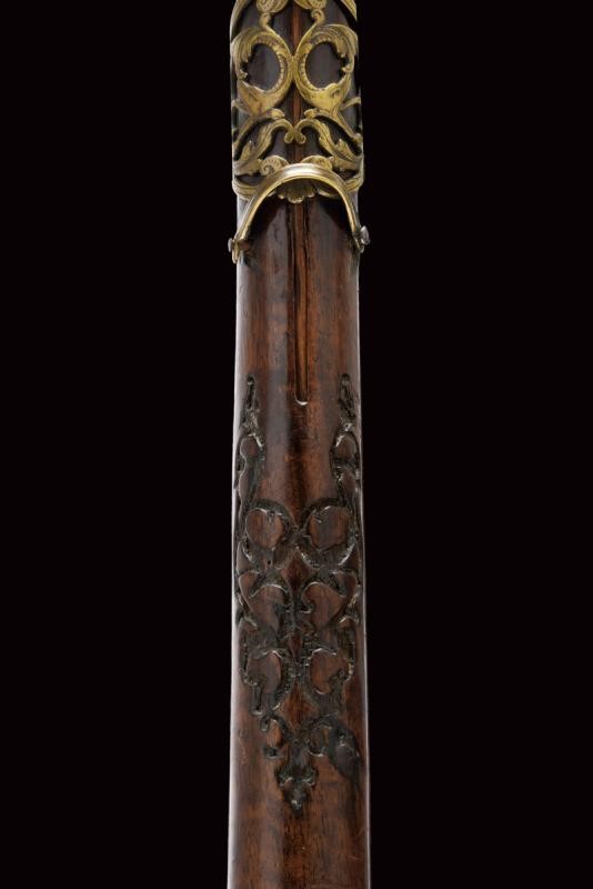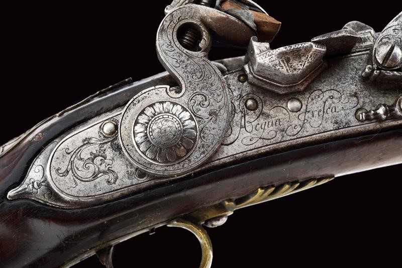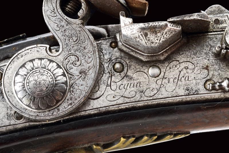 Smoothbore, octagonal, round, two-stage barrel, with remains of marks on the breech (pitting), rings and frames at the girdle, brass foresight; 17.4 mm cal. at the nozzle. Lock with flat lock plate and tang engraved with grotesque motifs, signed 'Acqua Fresca' at the center, the screw of the cock with fine flower decoration, the batterie engraved at the base. Working mechanism. Wooden half stock with brass mounts (two missing plates). Counterplate engraved and carved with a snake featuring open jaws, other snakes on the back hilt (a small missing part), fine fretwork barrel bracket with the same design. Horn-tipped, wooden ramrod with iron cartridge extractor.