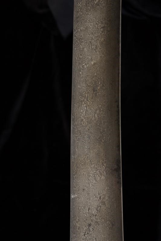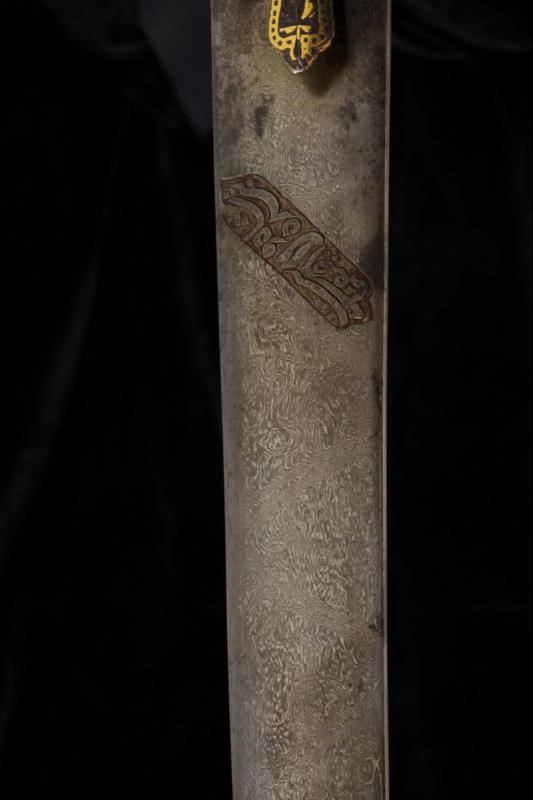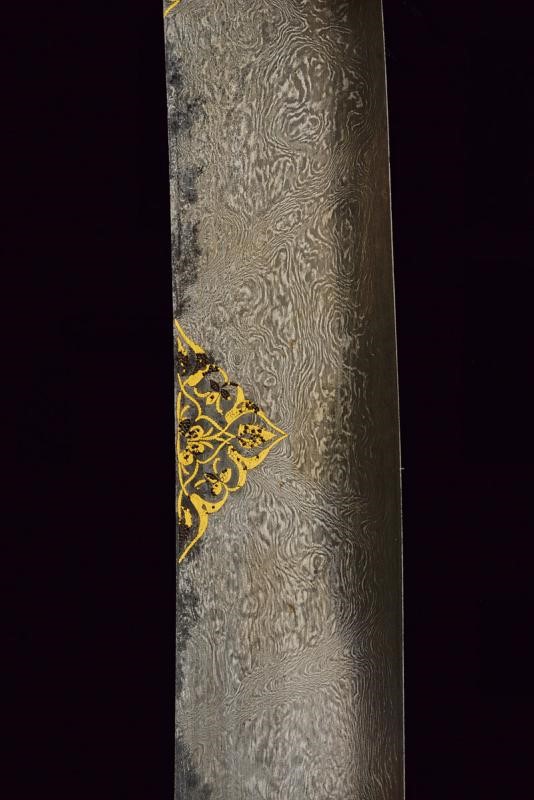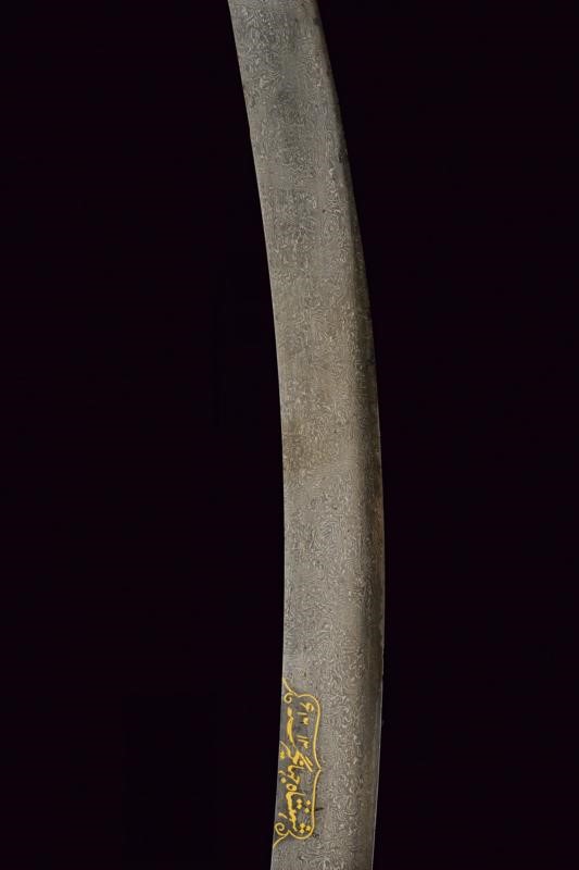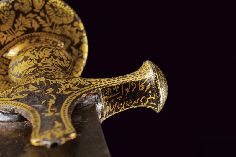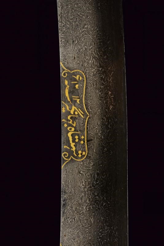 Flat, curved, single-edged "laddered" (or Kirk Narduban) blade made of wonderful damask crafted with oblique Muhammad's ladders (a technique much rarer than the traditional one); some areas with pitting. A golden cartouche with the inscription in Arabic "Shehanshah Jahangir Sunh" and date 1012 at the center of the right side. The base of the blade is obliquely engraved with "Bandah e Shah Wiltyat Esfahani", two other cartouches decorated with golden floral motifs and a third cartouche on the opposite side. Beautiful iron hilt finely decorated with yellow-gold inlaid floral inscriptions (some missing parts). Signed "Sarkar Nawab Yunsen Muhammad Khan" under one quillon.