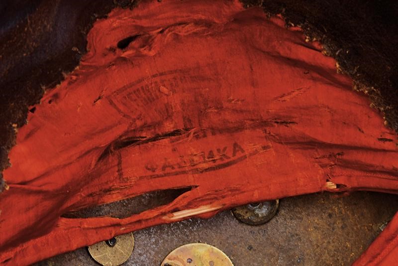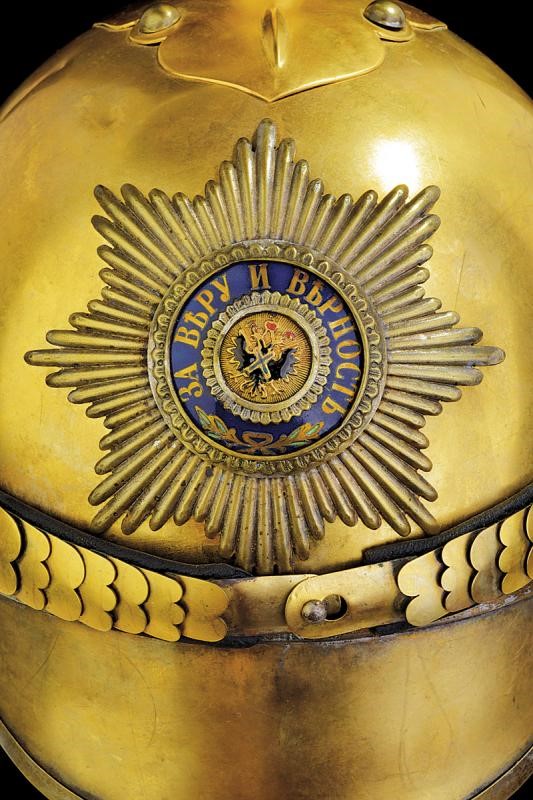 Three-plate, shrimp tail, tombac skull (in one piece, with missing parts) with round visor with silver border. Gilded chape on the top, moulded in gilded metal at the base (for Service dress uniform). Large star of the Order of St. Andrew on the front side, made of partially enameled and gilded silver, chin-strap with gilded scales covered with leather. Copper cockade with remains of enameled colours. The visor is covered with dark velvet, the tang with red velvet, large brown leather sweat band with red silk cap with remains of a stamp with a Cyrillic inscription (significant signs of use and time inside). Very rare.
