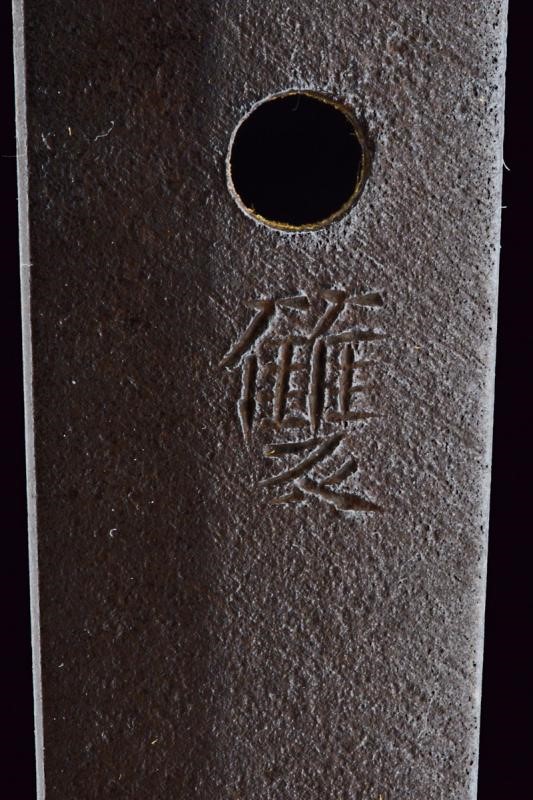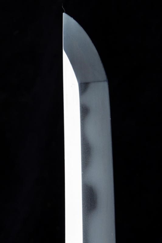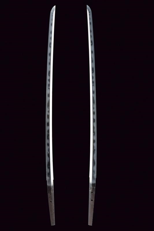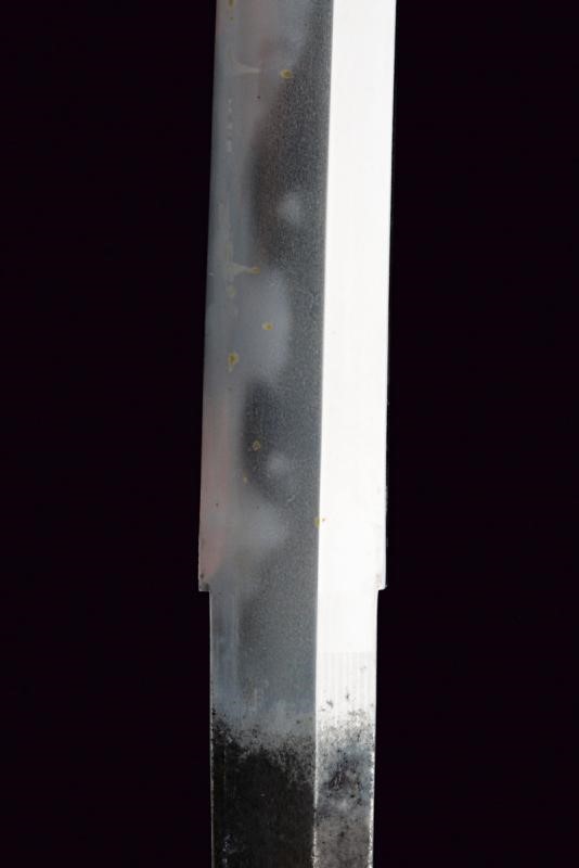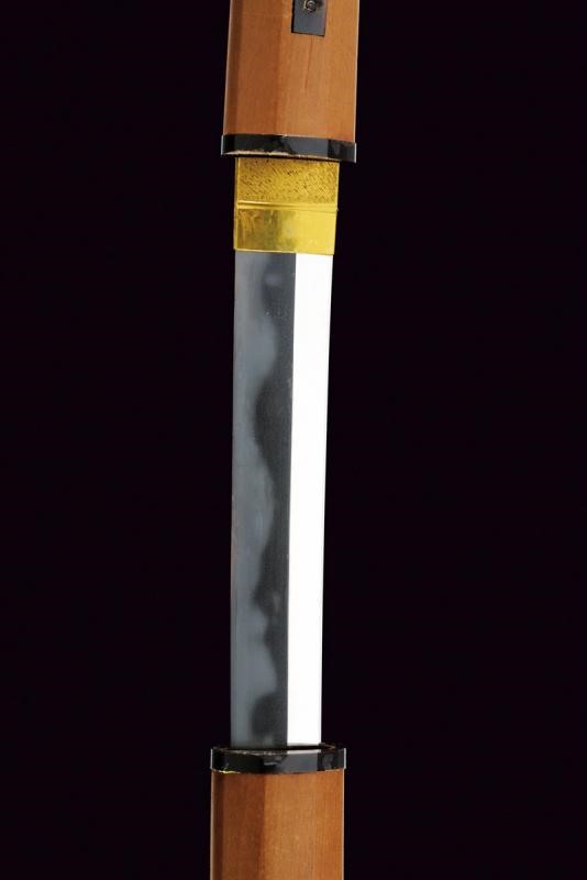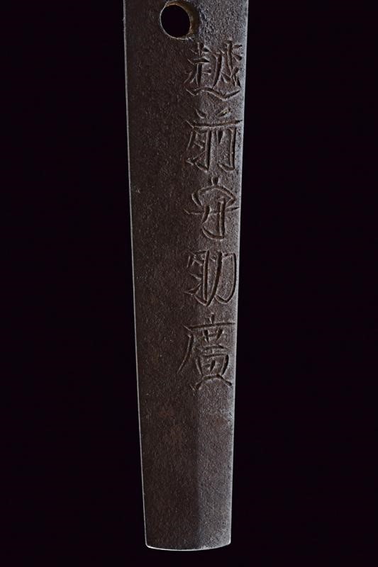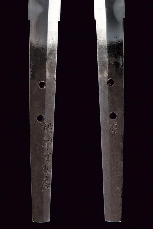 Shinogi-zukuri blade, Iori-mune. Nagasa: 72.9 cm. Clearly visible Hamon and hada. Nakago-suriage. Mei: Echizen no Kami Sukehiro. Two Mekugi-ana. Shinto era, c. 1670. Brown metal habaki covered with gilt foil. In Shirasaya.