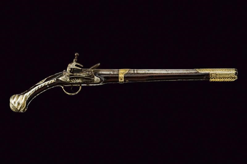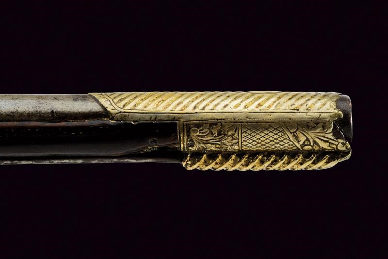 Smoothbore, two-stage, 16 mm cal. barrel, octagonal at the first part and decorated with ribs, then round; smooth tang with sight. Lightly decorated Morlach lock. Wooden full stock (small missing and damaged parts) with silver mounts, backstrap, trigger guard, counterplate and pommel decorated with oblique bands, the two barrel brackets decorated en suite, the one at the nozzle also with floral motifs. Remains of gilding. Some round, brass and nieloed inlays.