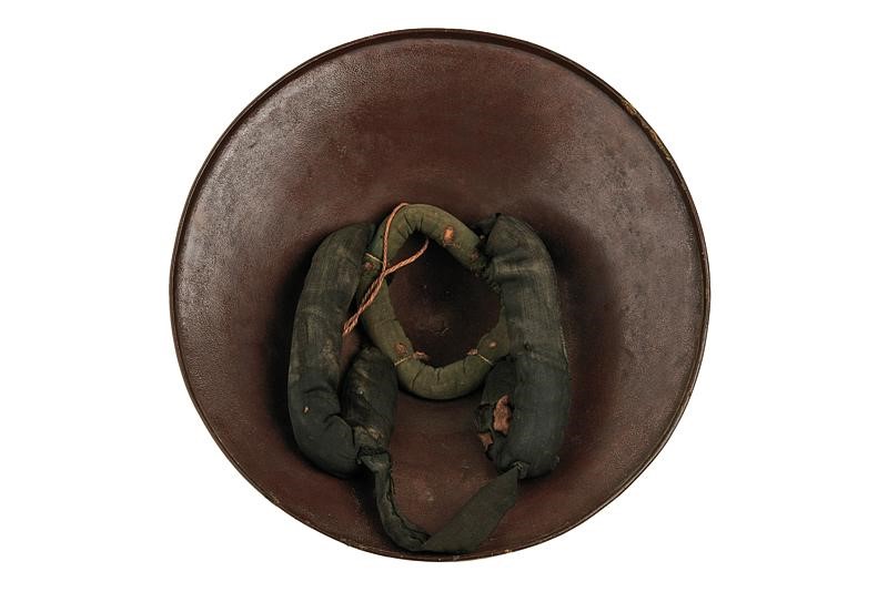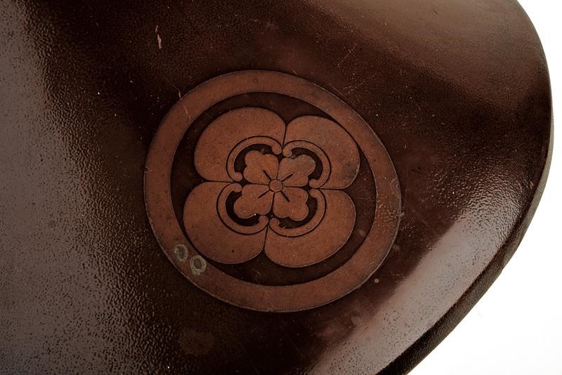 Light kanshitsu structure, rust-brown lacquered in Ishime-nuri. On the front a beautiful 'Maru-ni-mokkou-mon'. The brown lacquered interior complete with black cloth-lined laces. Used by the Samurai commanders of the Ashigaru Teppo-tai troops. Late Edo period.