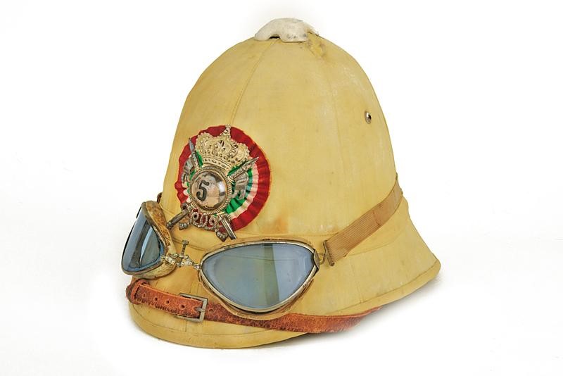 Cork body covered with cream-coloured linen, on the front ornament of the 5th lancer's regiment of Novara on a cockade; two air holes. Complete with leather chin-strap, leather sweat-band with manufacturer's mark. Defects and missing parts. With sun and sand glasses.
