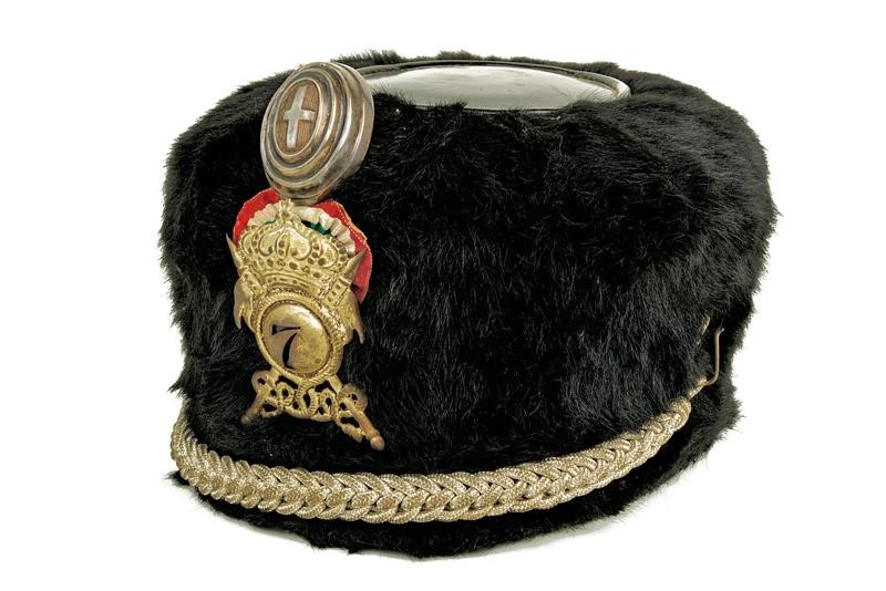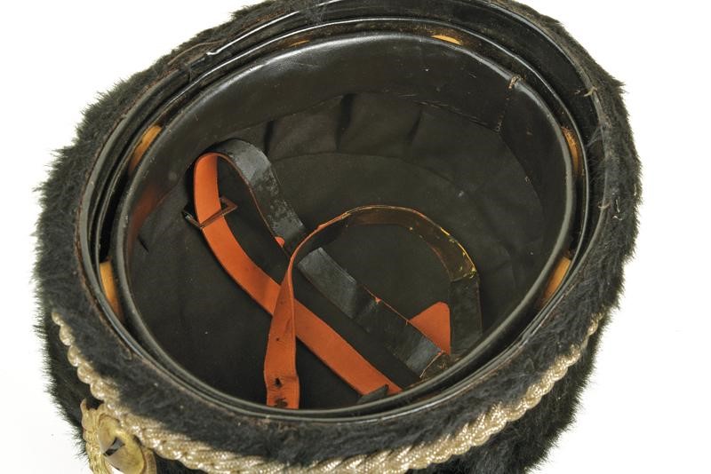 Black fur with leather peak, intertwined rope, crowned and pierced ornament with spears and under crown, tricolour cockade, silver tassel; inside large morocco leather and lined with black silk. Chin-strap. Rare.