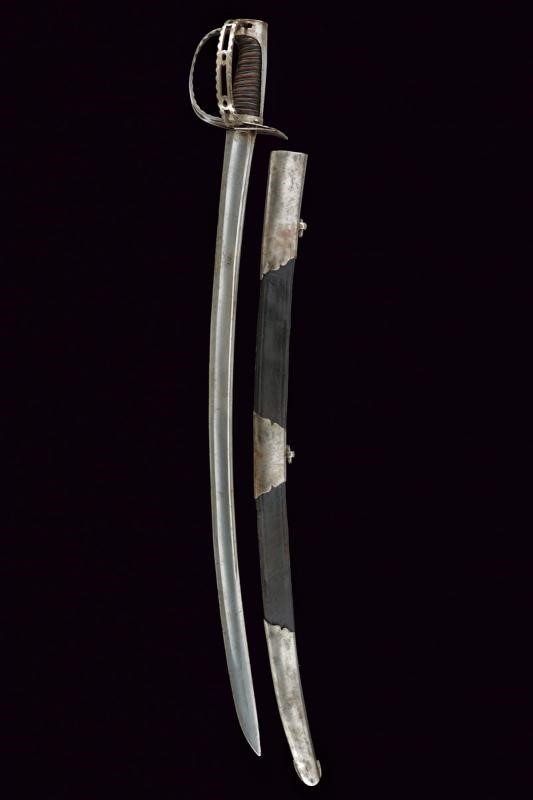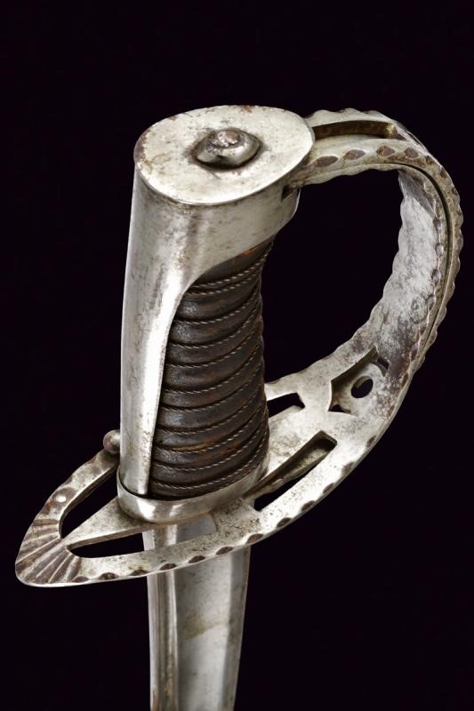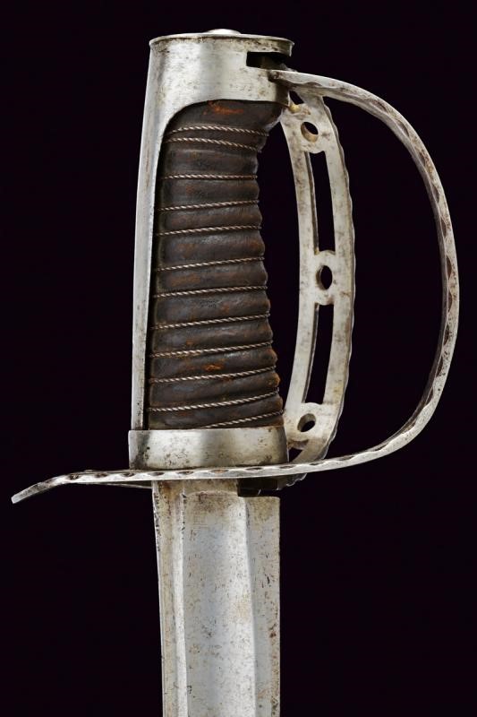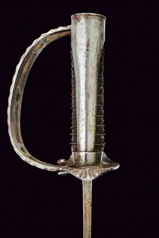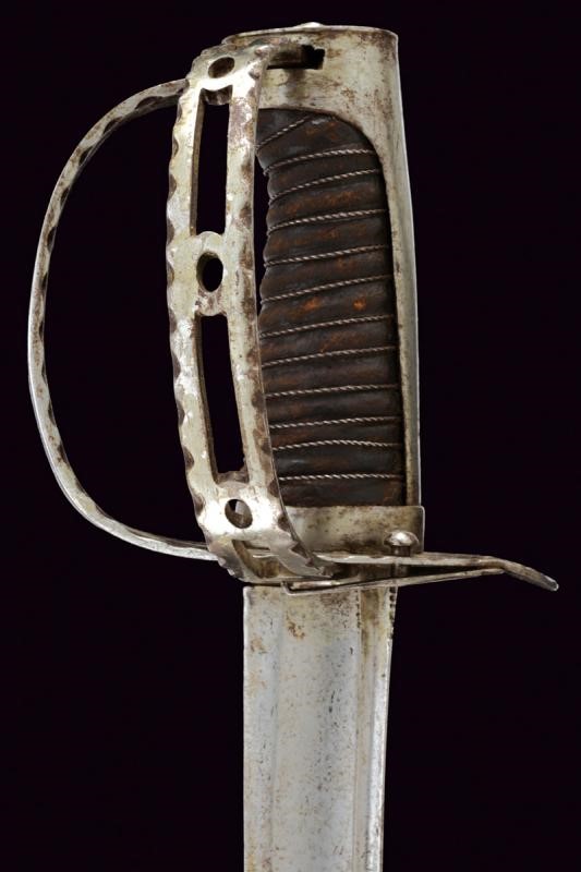 Curved, single-and short false-edged blade, with fuller for almost its entire length and provided with thin groove near the back. Steel hilt. Guard decorated with open-work and provided with a second loop-guard, decorated with open-work and with borders featuring notches. With hook for the turning guard on the right side, provided with a snap release button. Long smooth cap. Grip with probably earlier leather covering provided with iron wire binding. Probably earlier leather scabbard with two iron lugs.