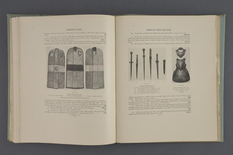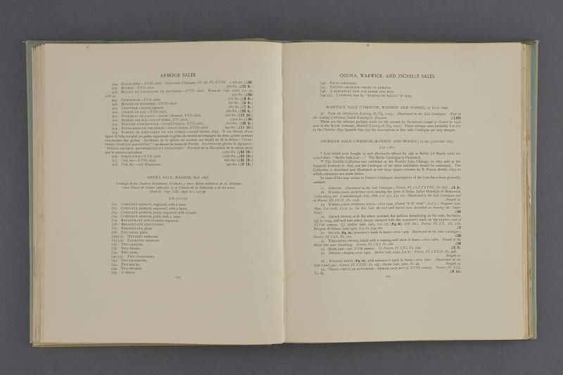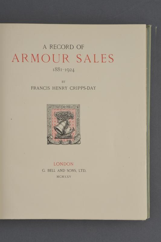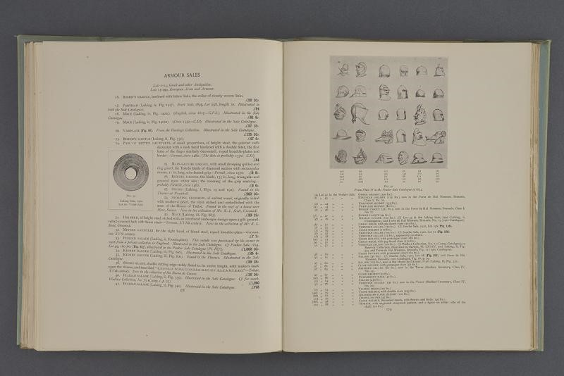 "A Record of Armour Sales 1881 - 1924"; London G. Bell And Sons, Ltd. MCMXXV. 68 pages of introduction plus 328 pages, all with English text. Registers of sales (including Spitzer) complete with sales prices. 202 b/w illustrations and photographs. Sand coloured cloth hard cover and with original dust jacket.