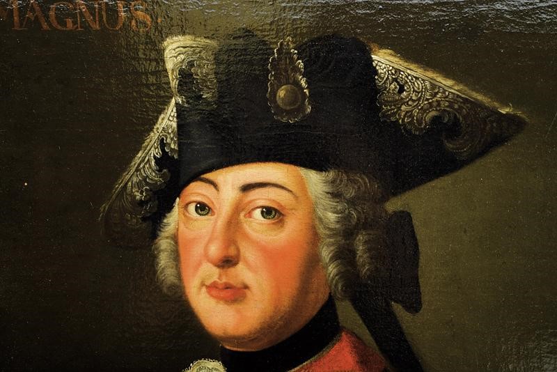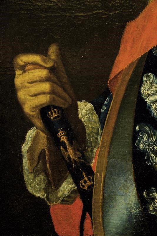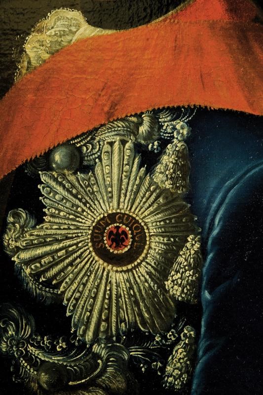 Oil on canvas. Beautiful portrait of the famous Prussian king in uniform with large plate of the Order of the Black Eagle and stick decorated with Prussian eagle and crowns. Above marked "FREDERICUS II BORVSSORUM REX IN PACE et BELLO MAGNUS". Of very high quality and conservation. Kept in thin wooden frame.