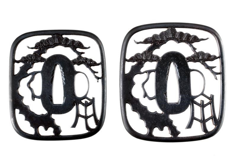 Made of iron, nade-kaku-gata, yo sukashi, ko-maru-mimi, smooth surface except for the pine crowns which are made with ke-bori engraving. The severe design depicts the trunk of an old pine tree with three branches, the typical sangai matsu and the travel basket of a yamabushi resting on the ground. Kogai and Kozuk-hitsu-ana. Late Edo period late 18th century. Kept in Kiri-box. Yamabushi (yarna - mountain and bushi - rest, lie) are ascetics who live by wandering the mountains in meditation and doing charitable activities. They are proper samurai tsubas since there is a little of the Yamabushi in each of them. It is the Myokin school of Tosa province, specialized in armours and producing tsubas since the 16th century. The hammered notches on the sides of the two hitsu-ana are the distinguishing features of each artist. Provenance: Compton Collection, Christie's sale, second part 1992, lot 45.
