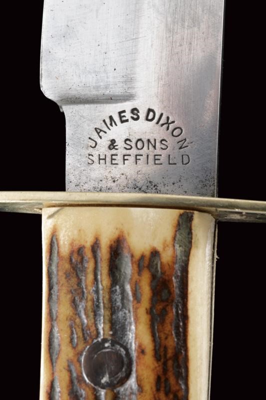 Straight single-edged blade, hollow at the weak, narrowed at the tang, marked "JAMES DIXON & SONS SHEFFIELD". Small brass quillon. Grip with deer horn grip scales, smooth white metal cap. Leather scabbard with smooth white metal mounts, missing hook.