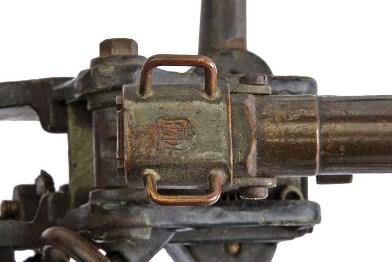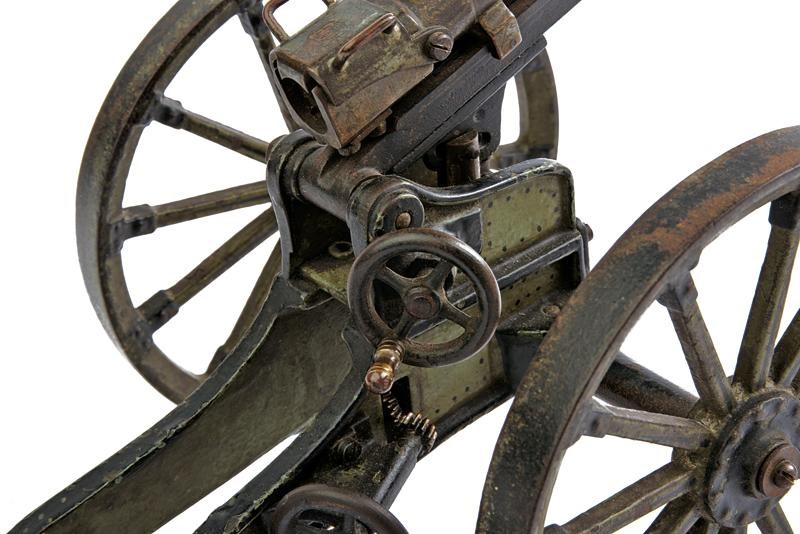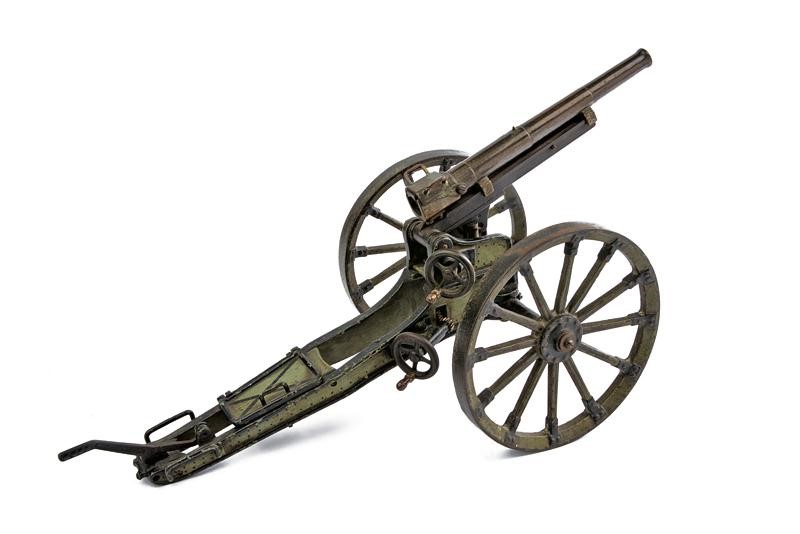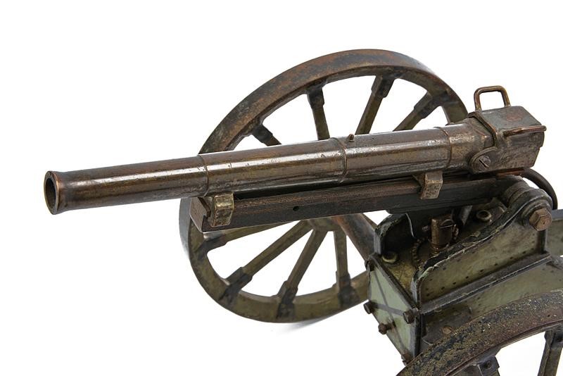 Completely made of metal, with a breechloading, four-stage barrel. Gun carriage with adjustable angle, the wheels angle is adjustable like the original World War I model to avoid the recoil. Partly painted in grey-green and black. Rare.