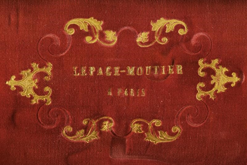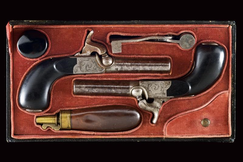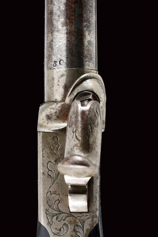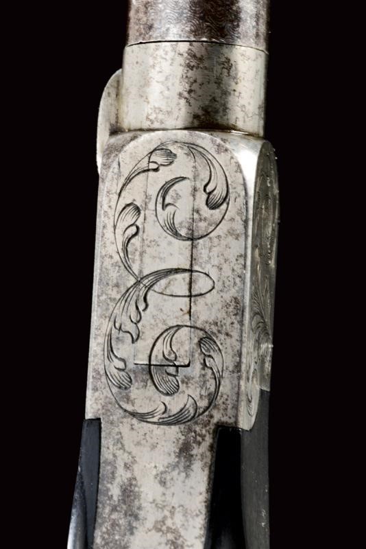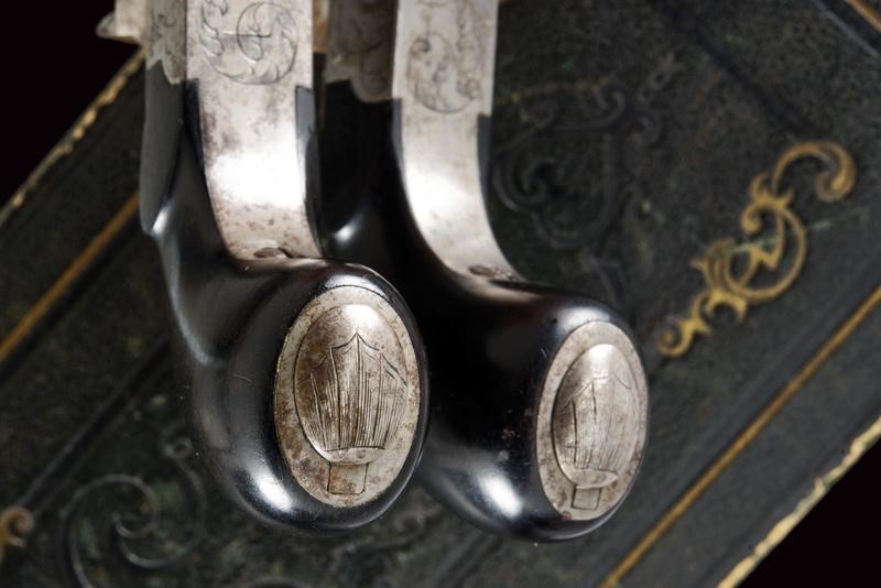 Smoothbore, round, turn-off, 11 mm cal. barrels; boxlock type frame engraved with floral motifs, with upper cock and foldaway trigger. Ebony, drop-shaped butt with iron drum. Kept in their wooden case covered with black paper, with partially gilded imprints, lined with red velvet with gold name "Lepage-Moutier" between floral decorations. Complete with flask, box and multi-purpose bullet mold.