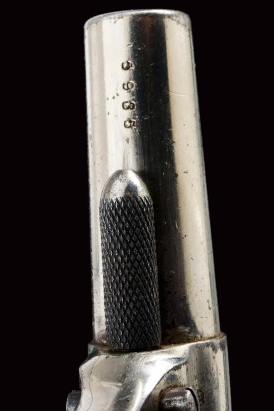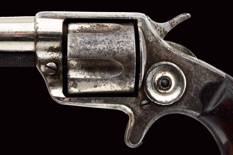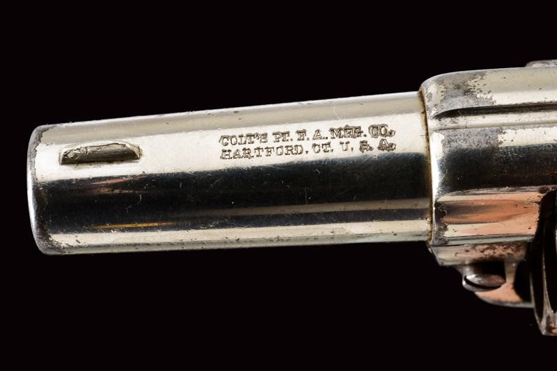 Round, rifled barrel, marked with the company address in two lines, provided with front sight, marked "COLT NEW 41" on one side. Visible rifling. Grooved, five-shot cylinder, spur trigger, frame with mark of the calibre, smooth wooden grips. Working mechanism. Remains of old nickel plating.