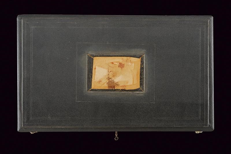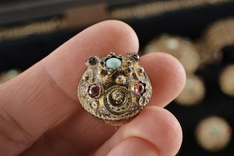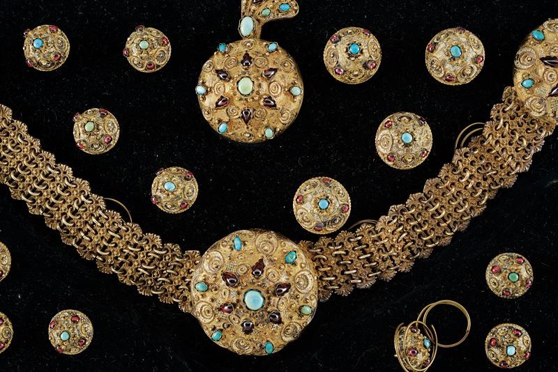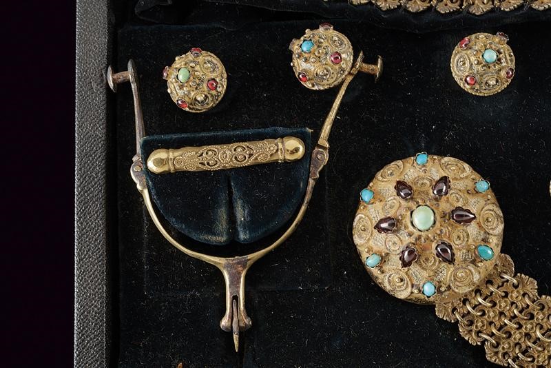 Made of gilded silver and richly decorated with turquoises and red glass cabochon stones, partially enameled and decorated with filigree. With belt, collar, headpiece frieze, chain, pair of spurs, nine large buttons and thirty-three small buttons. In box. The plaque on the lid is missing. Beautiful and rare set.