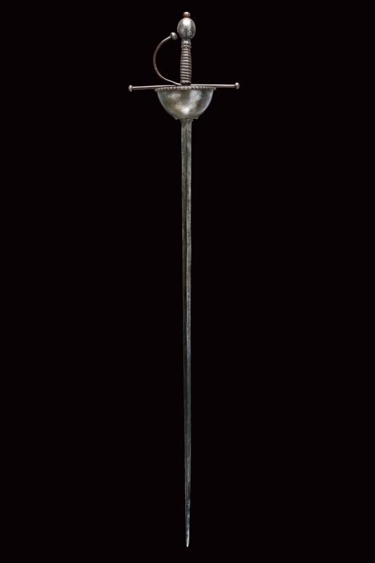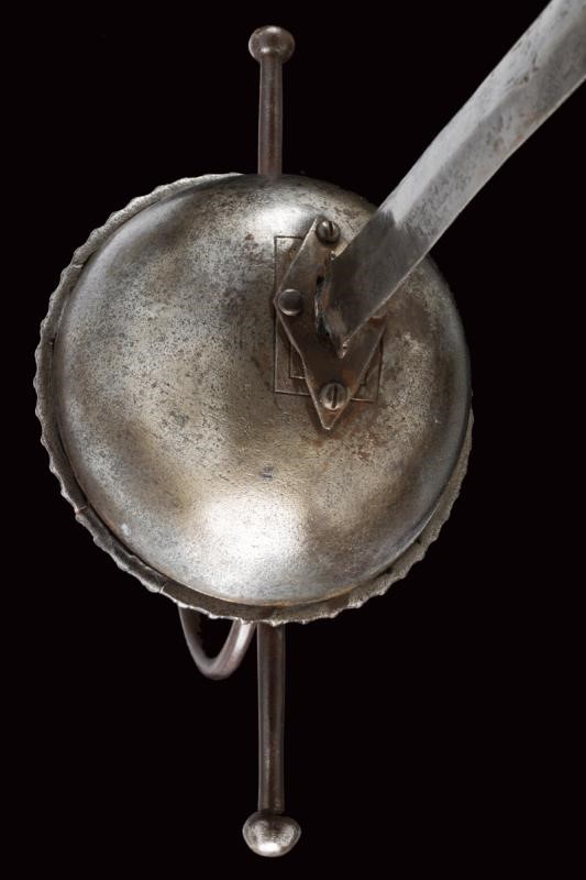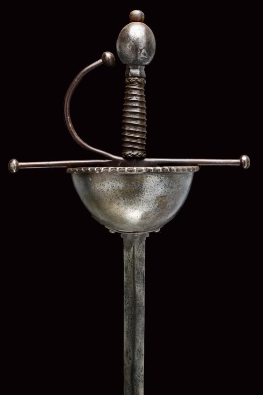 Straight, double-edged blade of lozenge section, provided with two small lobes at the base and with ricasso. Cup-shaped hilt with roped edge, worked with small raisers. Hilt and guard with flattened, spheroid ends. Handle with Moor's heads and metal wire binding. Pommel shaped as a buttoned olive.
