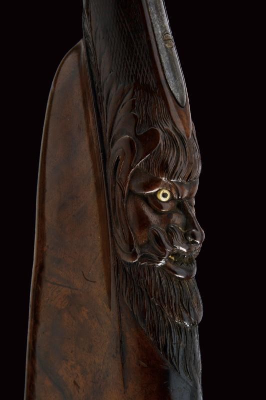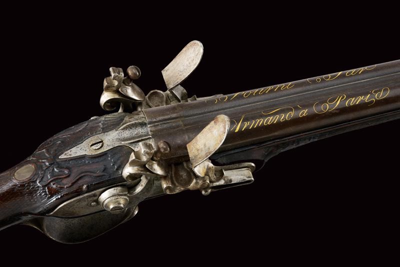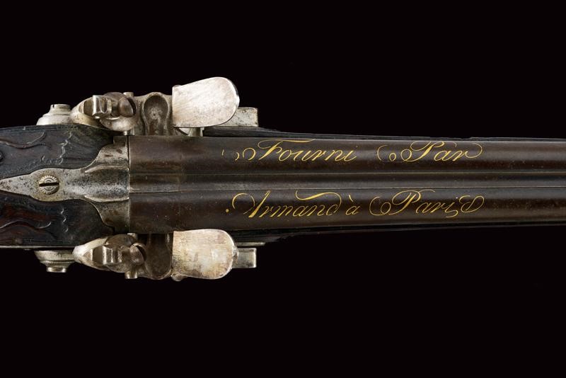 Round, smoothbore, juxtaposed, 15 mm cal. barrels, stamped in gold "Fourni Par Armand à Paris" at the base, rib with foresight; tang with broad sight; flintlocks with remains of a signature and decorated with floral motifs. Half stock of fine briarwood checkered at the grip and with checkered palm rest, the butt sculpted with a bearded man's face, the eyes of glass. Iron mounts, trigger guard engraved with a bird, the tip with floral motifs. Missing ramrod. Working mechanism. Several signs of use.