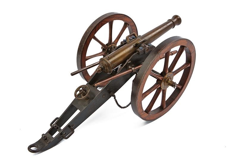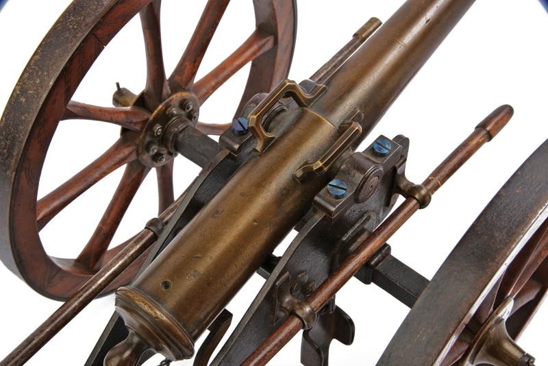 Round barrel, with moulded muzzle and three rings; breech with vent, oval pommel; cylindrical trunnions; angled handles, mounted on fine iron shaft and provided with large wooden wheels reinforced with iron foil, brakes on chains and ramrods.
