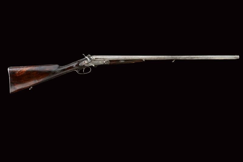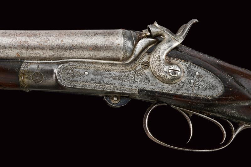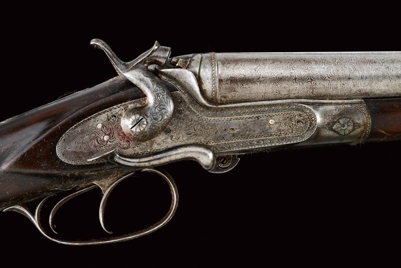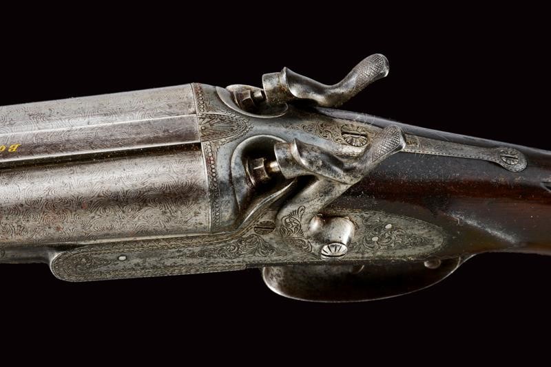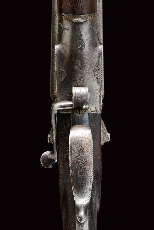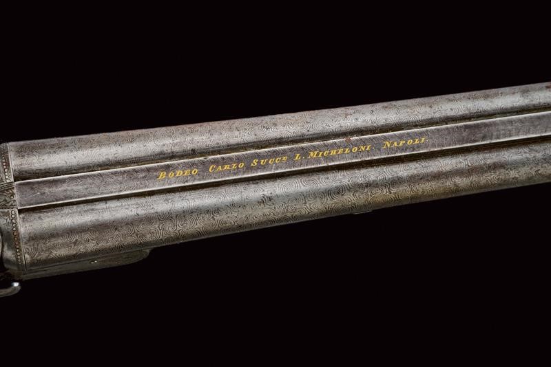 Round, smoothbore, swiveling, 17 mm cal barrels made of fine damask, with rib marked "BODEO CARLO SUCC.E L. MICHELONI NAPOLI" in gold, front sight; tang engraved with floral motifs; forward spring lock with external hammers finely engraved en suite, checkered wooden butt and fore-end (small damage), iron mounts decorated en suite, lever on the right side to open the barrels. In patina.
