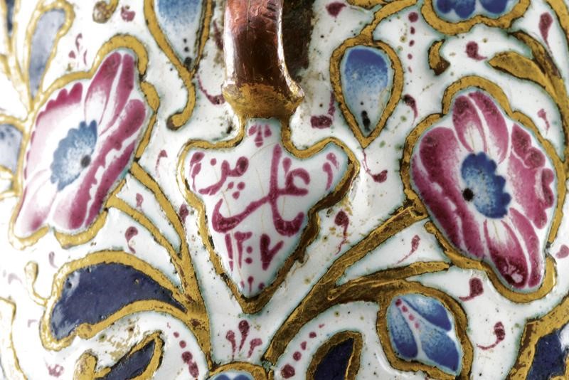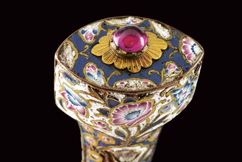 Slightly-curved, double-edged blade, ribbed at the center, probably made of damask. Yellow metal scabbard and hilt, both completely enameled in polychromy with floral motifs, gilded borders. Hilt with small pitting on one side and glass, cabochon stone on the pommel.