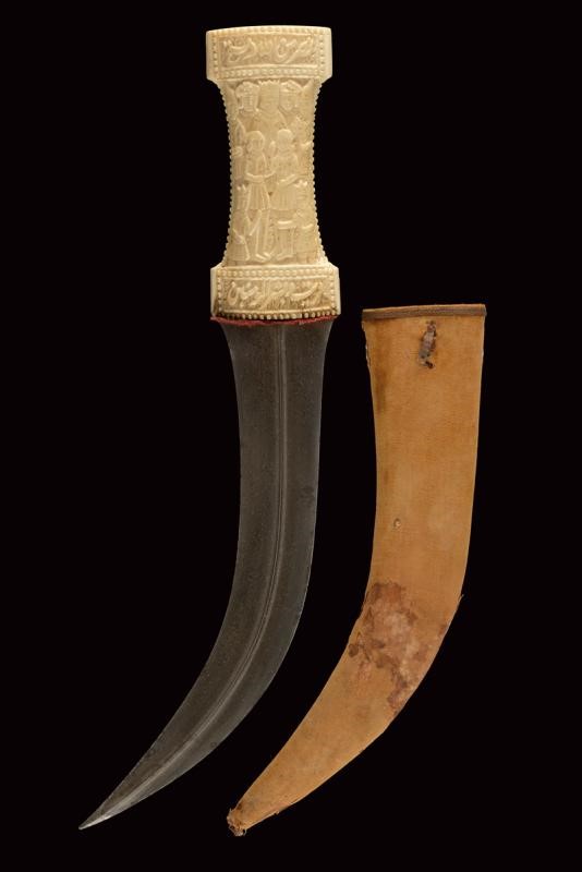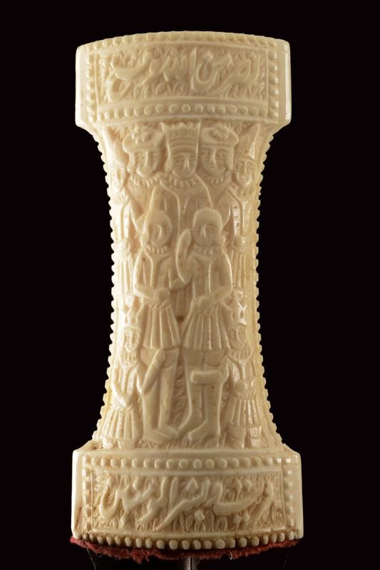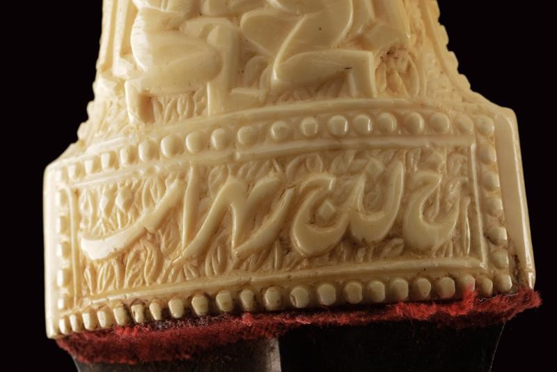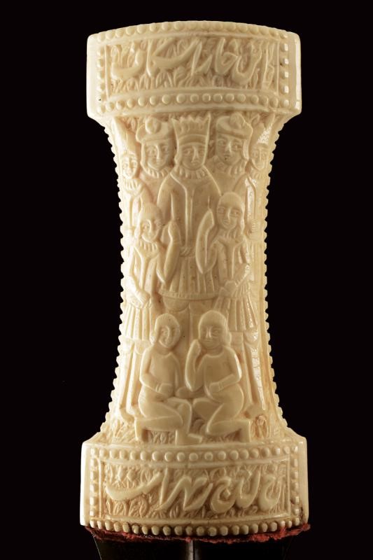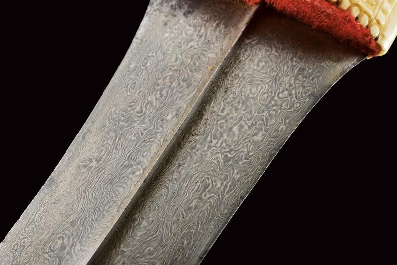 Double-edged blade made of fine damask, with very curved tip and central rib. Double "T" grip made of walrus tooth (clearly visible at the pommel) richly carved with figures and inscriptions in Arabic. Wooden scabbard with remains of the old velvet covering.