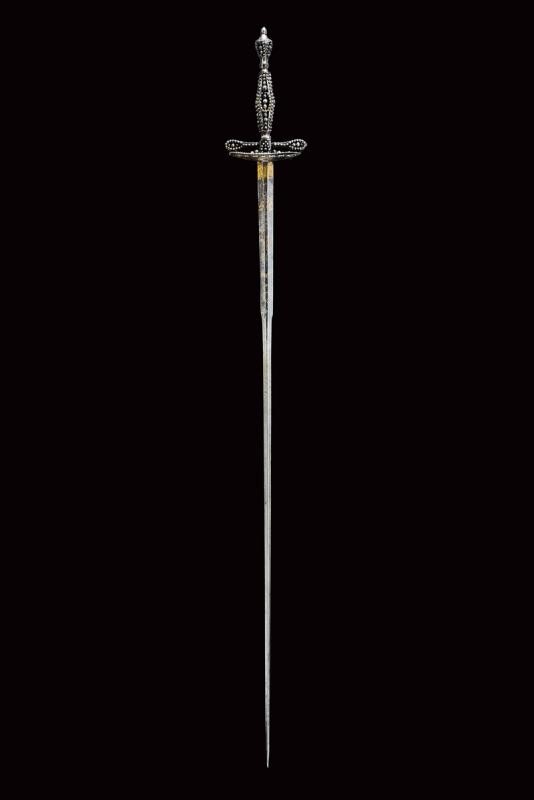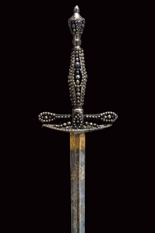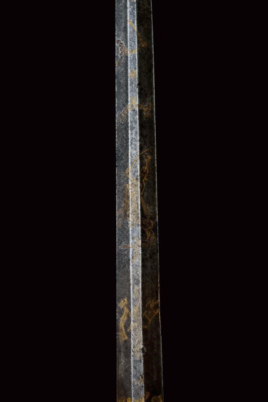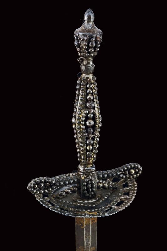 Colichemarde, double-edged blade, with enlarged base and hexagonal section, engraved and gilded on remains of blue background with crescent, Pandur, trophies and floral motifs. Iron hilt richly decorated with steel beads (slightly wobbly).