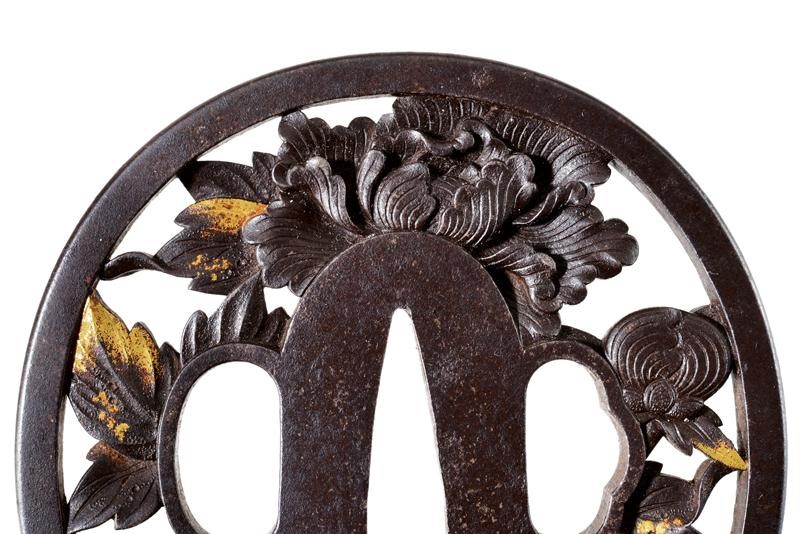 Made of sukashi iron with gold decoration, maru gata, maru mimi. The depiction of the peonies is enriched by the gilding of the leaves, a very fine shading technique. This tecnique is typical of the Bushu school. Late Edo period, late 18th century. In Kiri box.