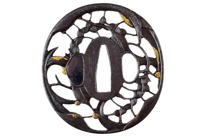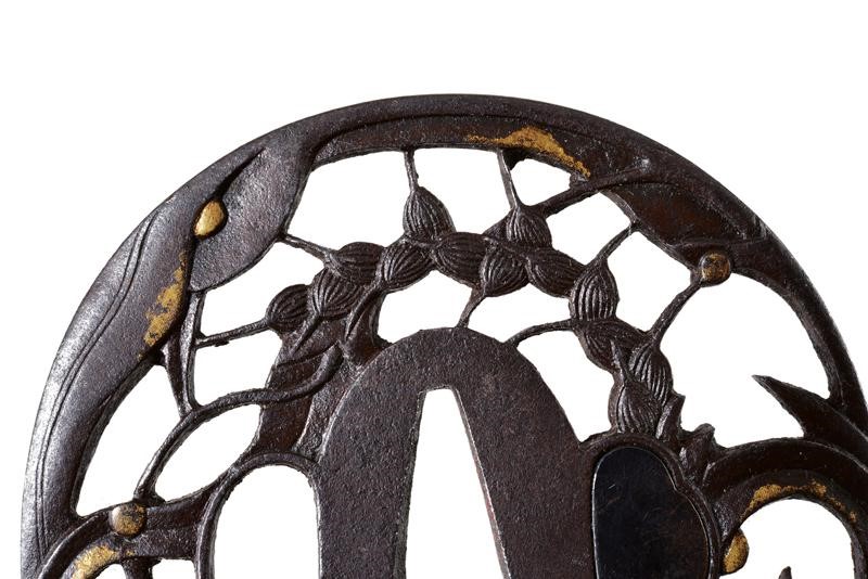 Made of iron, nade-maru-gata, yo-sukashi, depicting two ears of millet, awa, with leaves. The very fine details in fine carving with gold nunome representing dew moisture. Kozuka-hitsu-ana open, Kogai-hitsu-ana with Ategane. Cooked millet was widely used in soups together with vegetables. The Shoami and Ito schools were created in the 17th century in Sagami, the founders were students of Umetada specialized in various fields and some of them moved to Edo. Subjects were initially geometric and then became naturalistic, especially in the artists working in Edo in the first half of the 19th century.