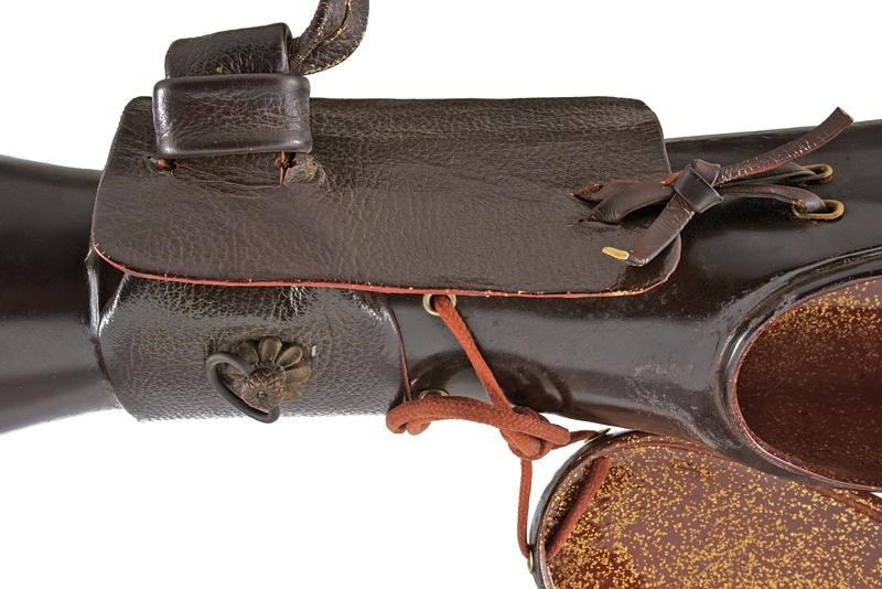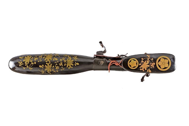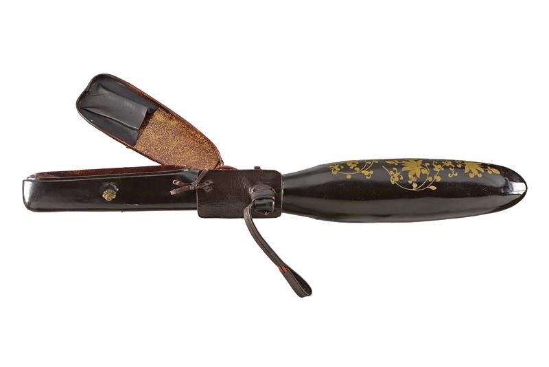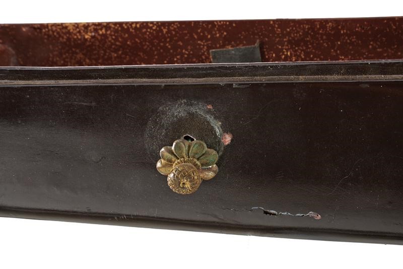 Made of wood and black lacquered papier-mâché with Makie in Karakusa-monyo and 'Maru-ni-kikyo mon' in gold. The central part featuring a leather band and a suspension with brass ring on a flower-shaped base at the center. The lid lace is missing. Late Edo period.