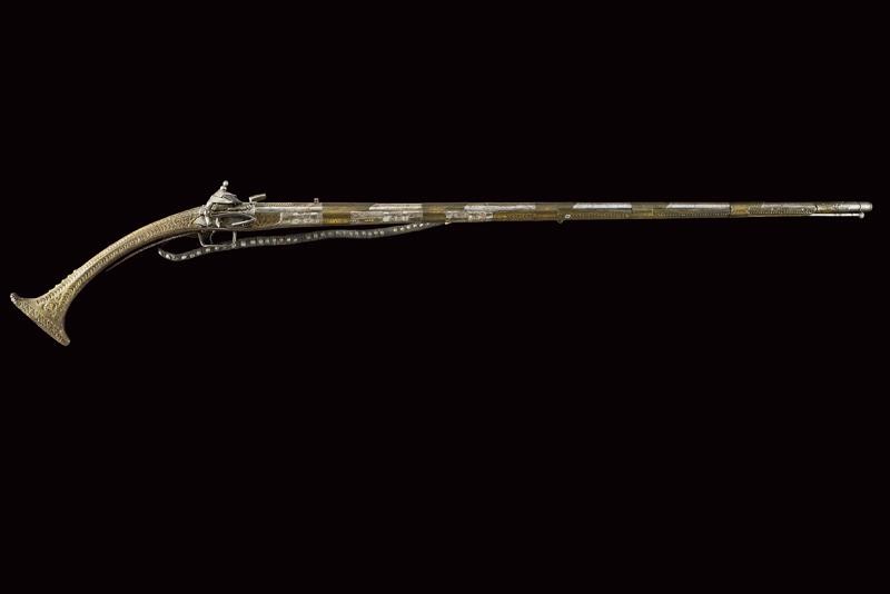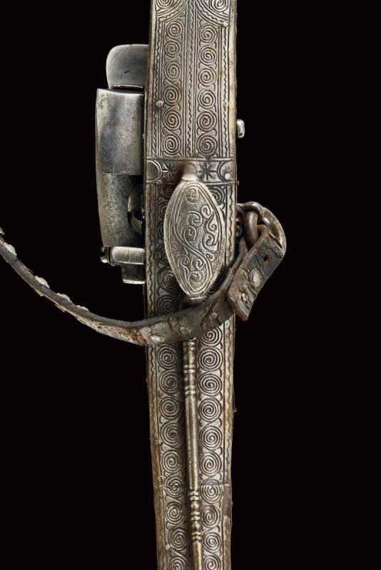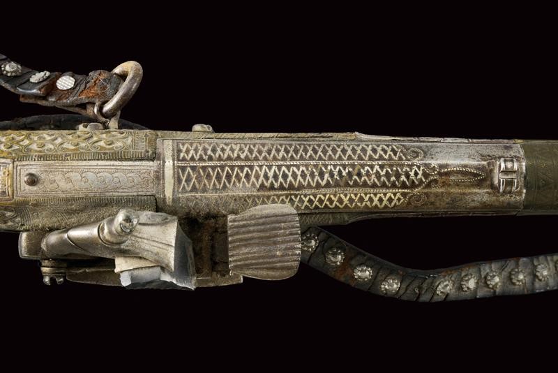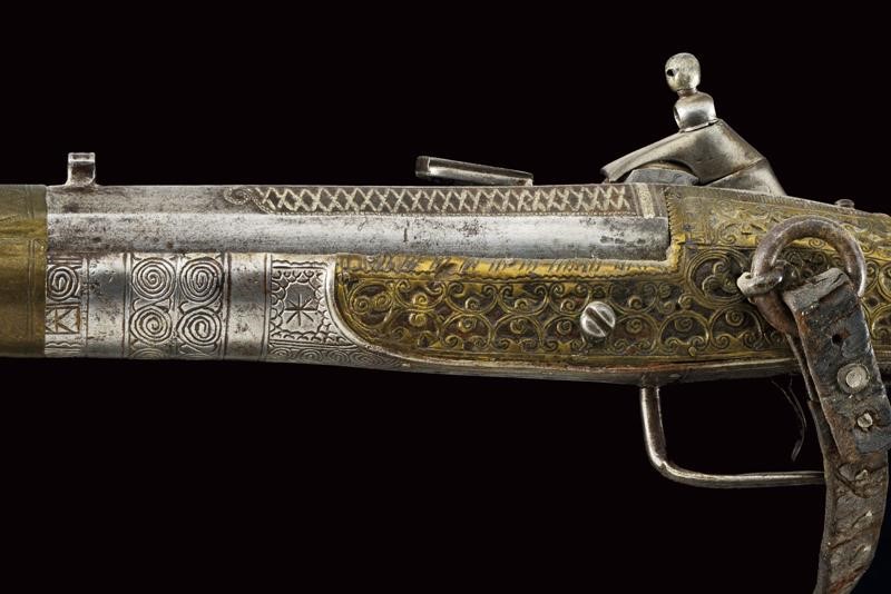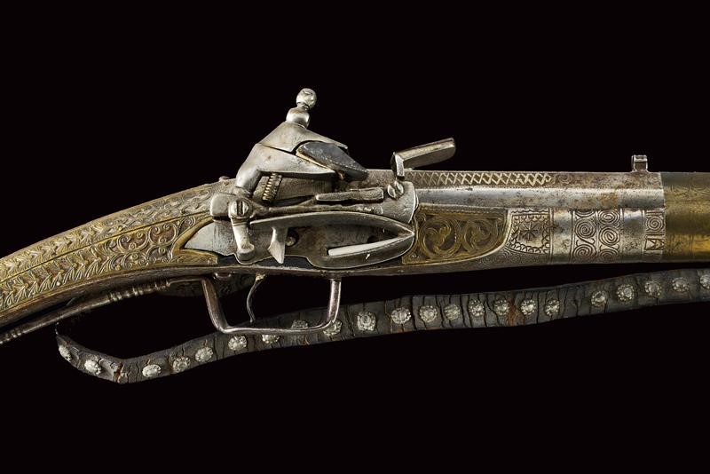 Smoothbore, two-stage, octagonal and round, 16 mm cal barrel, with small, plumed, silver-inlaid moulded muzzle at the nozzle, net-shaped inlays at the base. Morlach flintlock. Working mechanism. Interesting metal stock. Iron fore-end, richly engraved with geometric motifs and spirals, then with richly decorated, brass inlays towards the nozzle. The grip and the butt stock with brass inlays decorated in relief with scrolls on a background that probably was enamelled. Iron trigger guard engraved en suite. Brass barrel brackets, engraved with floral motifs. Iron ramrod. Probably antique strap (damaged), decorated with studs. Interesting.