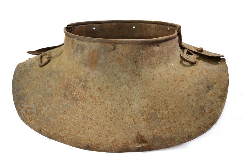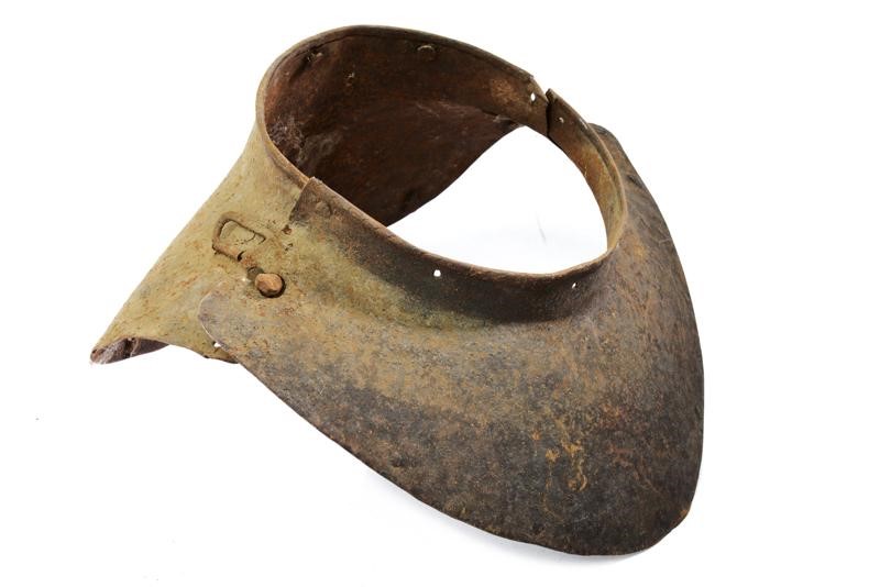 Consisting of two plates riveted together only on one side. Neckline with smooth rope. Back plate complete with assembly buckles. In antique patina.