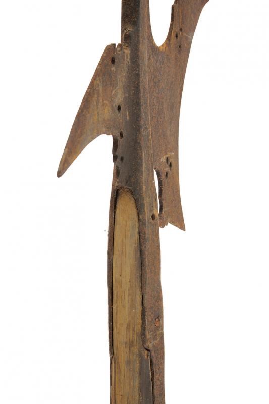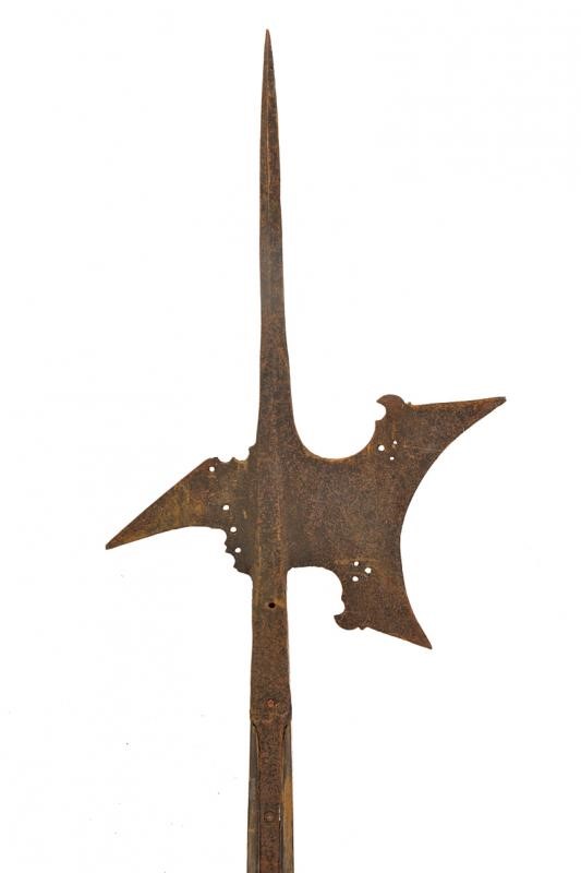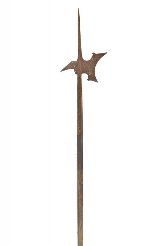 Spearhead with short, squared cusp, hollow axe with beak-shaped lugs and open-works, straight rear fluke. Medium-length straps. On wooden shaft, probably later (holes and woodworm damage). In antique patina.