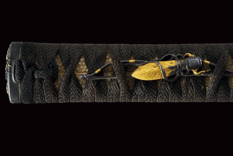 Shinogi Zukuri Iorimune blade; Nagasa (length: 70.5 cm); Hada: Nashiji with Ji Nie; Hamon: Gunome Midare Nie Deki Kinsuji Sunagashi; Kissaki: Chu Kissaki; Boshi: Suguha Ko Maru Kaeri Yoru; Habaki of gilded and engraved silver. Nakago Ubu Hiriyama Gata; Yasurime: Sujikai. Mainly on one side areas with holes and seriously damaged on the surface (largely recoverable by appropriate polishing). Important Koshirae with beautiful iron tsuba richly pierced and carved with katana, kabuto, do and other partially gilded parts of the armour. Fuchi-Kashira finely decorated with floral motifs of various metals on a matt granulated background. Rare very long menuki (8.7 cm) representing a bow with partially gilded quivers. Tsuka of considerable length. Remarkable saya with very elegant horizontal band pattern; koiguchi (very small missing part) and black horn kurigata; kojiri of gilded metal decorated with granulate.