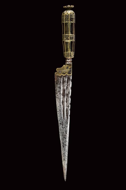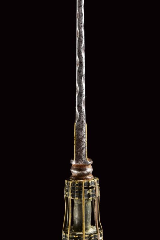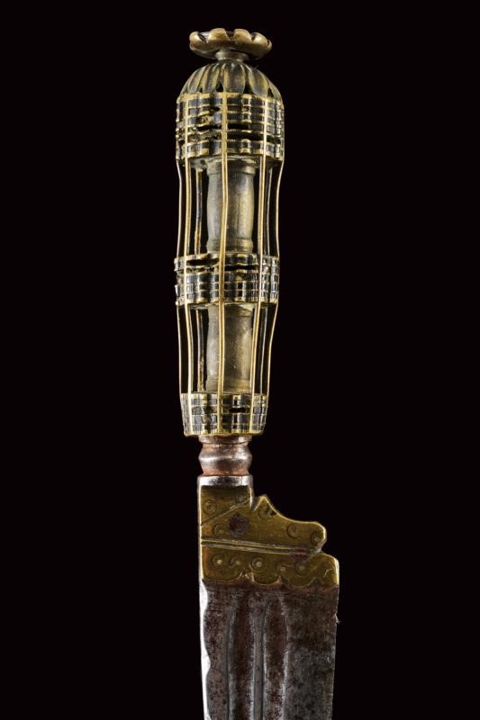 Straight, single-edged blade (pitting and signs of time) with double fuller and wavy carving on the back. Tang covered with brass foils engraved with small circles. Small, iron knot. Brass lantern-shaped grip, with small ebony or horn inlays (missing parts). Brass cap carved as a bud, like the large button.