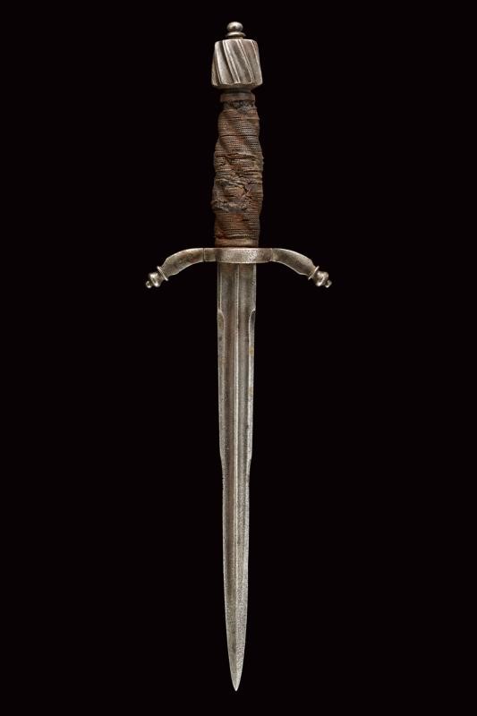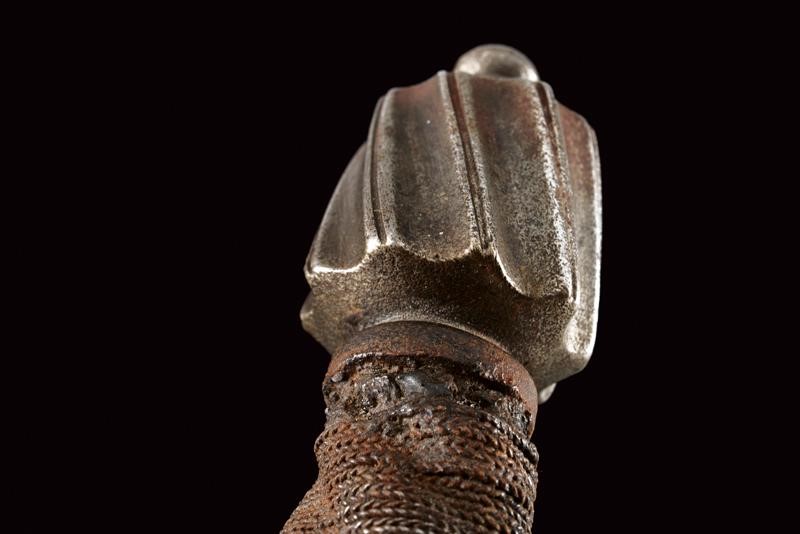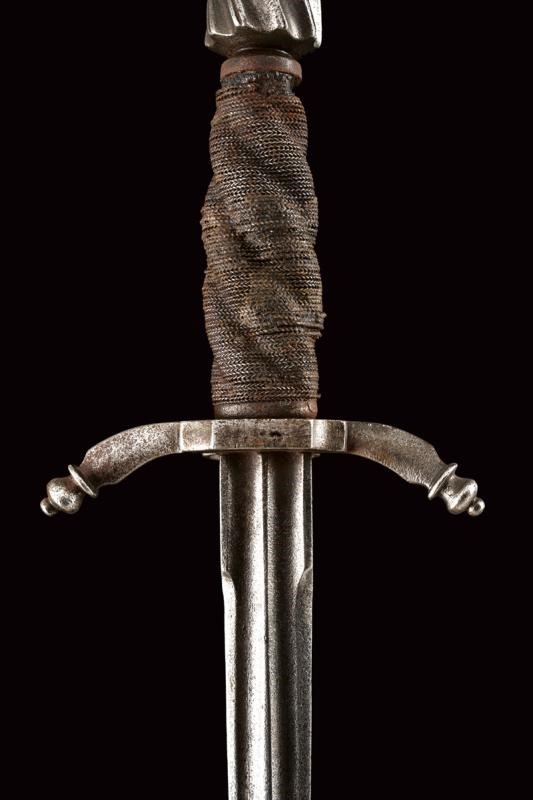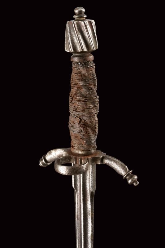 Straight, double-edged blade with central cannelure and two grooves starting from the tang. Iron hilt with quillons curved towards the blade and button-shaped edges. Parry ring. Fine pommel with oblique grooves. Grip with remains of metal wire binding.