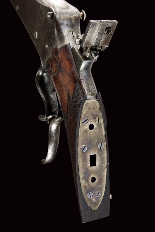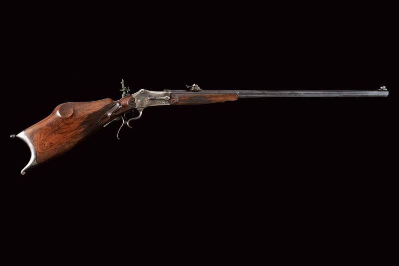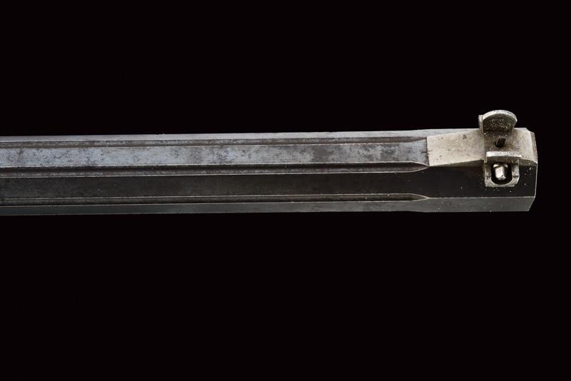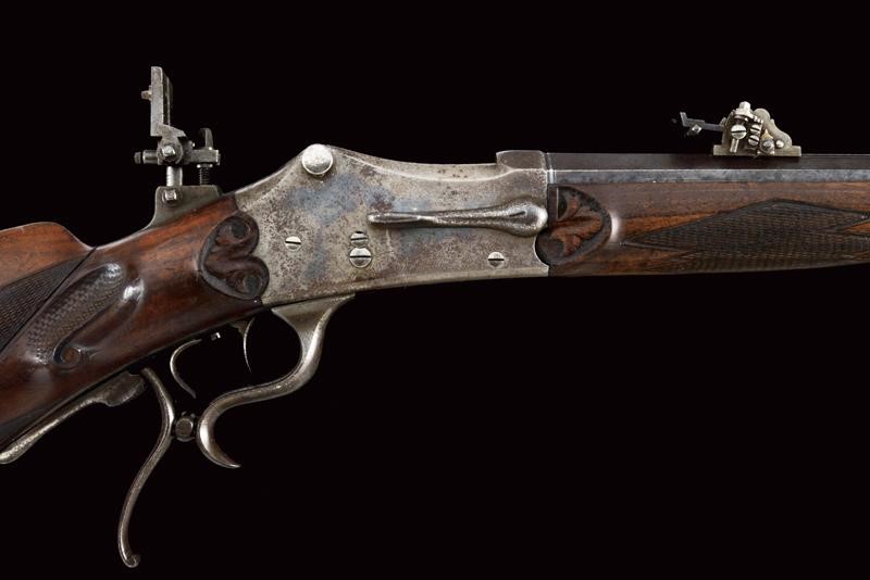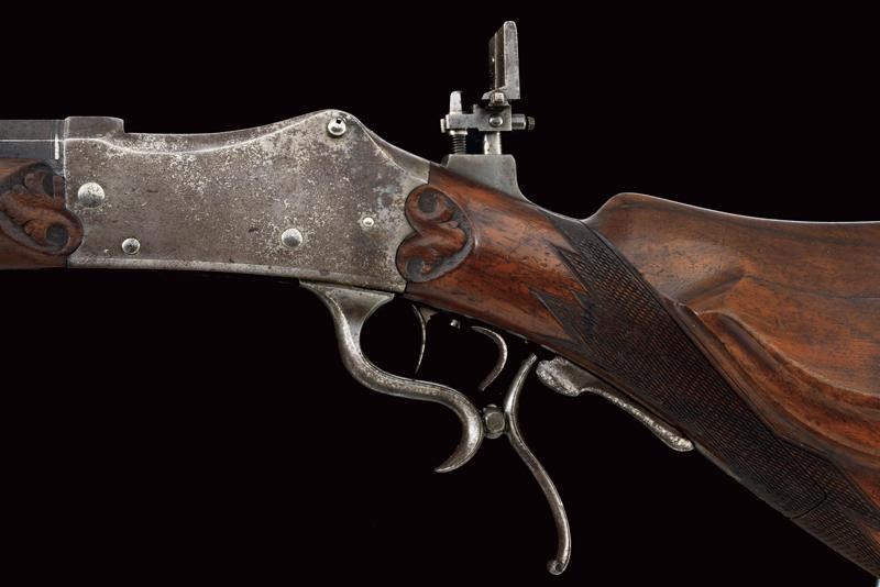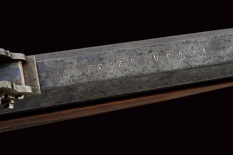 Octagonal, 9 mm cal barrel (clean bore, visible rifling), decorated with grooved segments, provided with adjustable front sight and rear sight. Signed "IOS EGGER MERAN" on the back. Falling block, Martini-type frame. The upper tang fitted with peep sight. Loading through the trigger guard lever. Working trigger and set trigger. Wooden butt plate and fore-end. Both with checkered elements. Iron mounts, butt plate with tangs. With levers to quickly disassemble it.