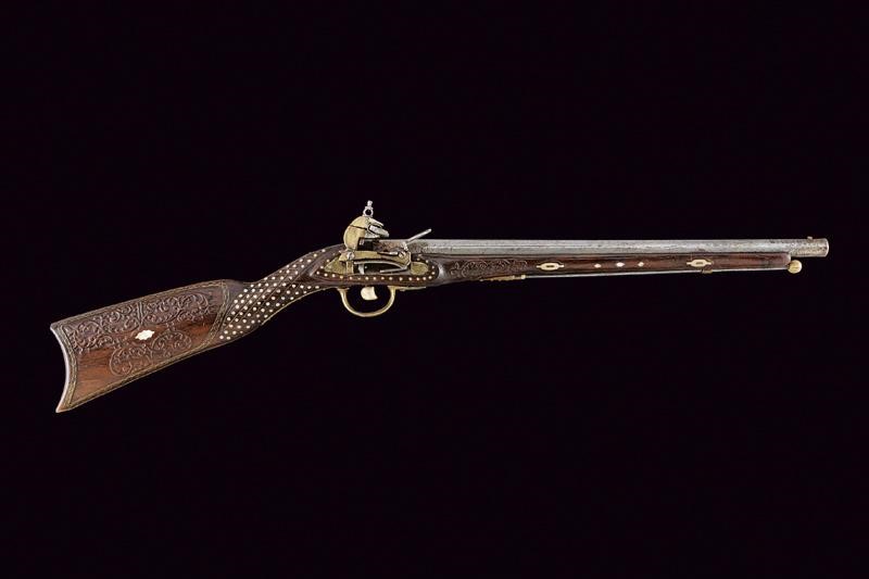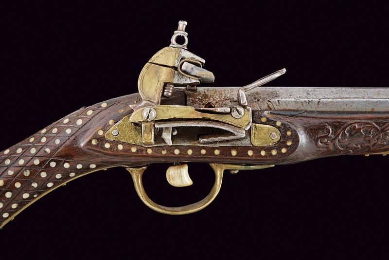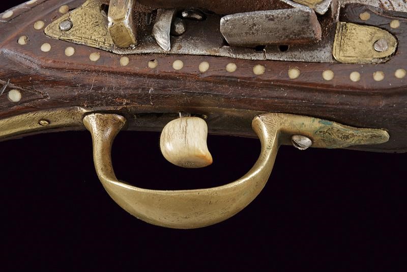 Smoothbore, round, 15 mm cal. barrel, with square base and rib, brass foresight and rear sight; miquelet lock partly covered with brass foil. Wooden full stock richly carved with floral motifs and inlaid with mother-of-pearl, bone and brass filigree. Brass mounts. Bone trigger and ramrod tip.