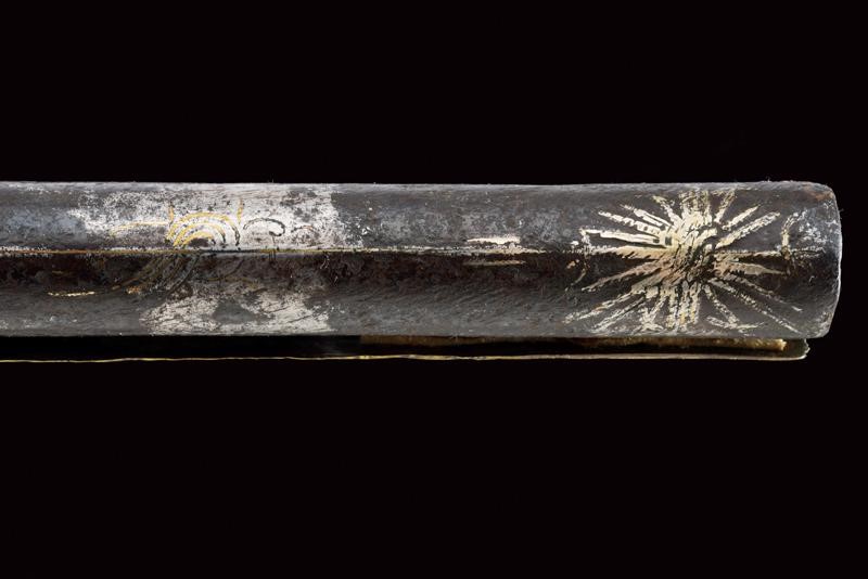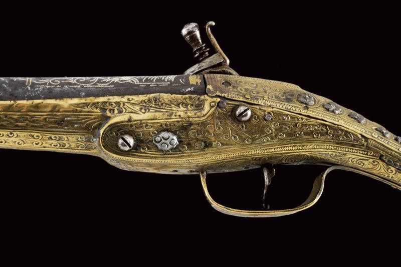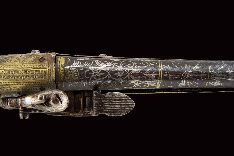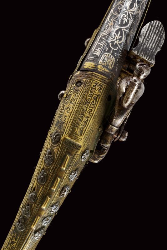 Smoothbore, two-stage, 16 mm cal. barrel, engraved with silver and brass inlays, with floral and geometric motifs over the entire length; lock engraved, carved and partially pierced; brass stock engraved with floral and geometric motifs, the butt with white metal decorations. The long cusped cone is faceted. Small defects and missing parts.