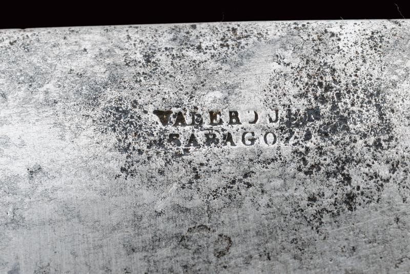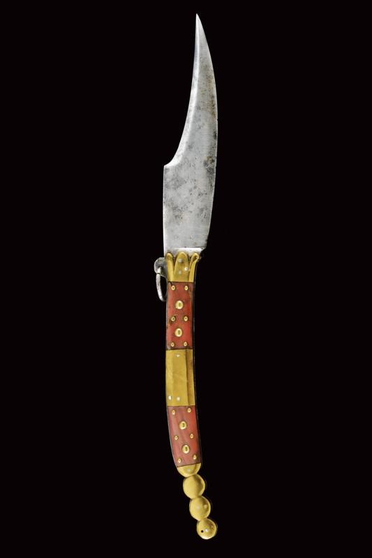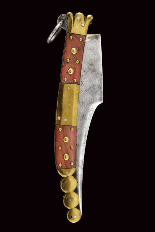 Folding, single-edged blade with angled and partially hollow back, with remains of marking "VALERO JUN ...ARAGOZA". Iron grip and back. Some pitting. Brass mounts. Light-coloured, horn grips (one with cracks) painted with red at the bottom and held by small, brass studs. Iron suspension ring.