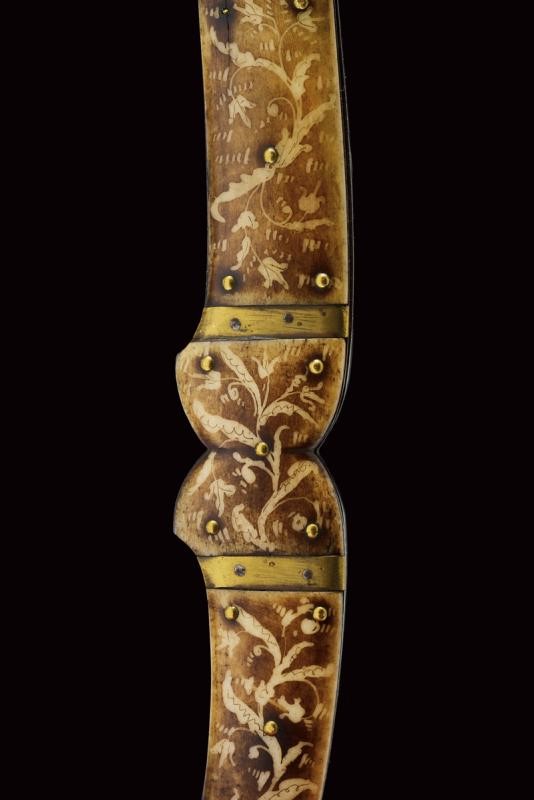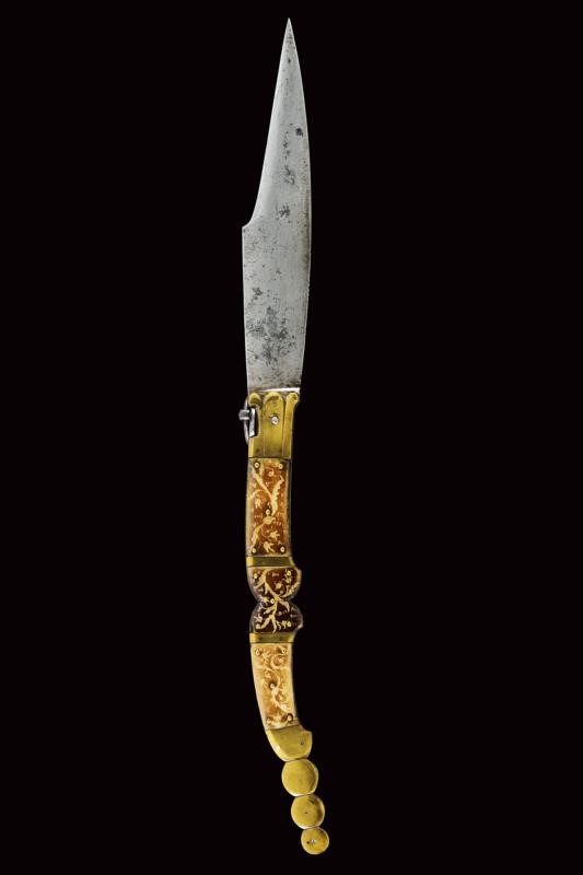 Folding, slightly-angled, hollow, single-edged blade, with marking "VALERO JUN ZARAGO...A" (not clearly legible) on one side. Iron grip and backstrap. Brass mounts. Bone grips decorated with racemes. Large, iron suspension ring. French manufacture for the Spanish market?