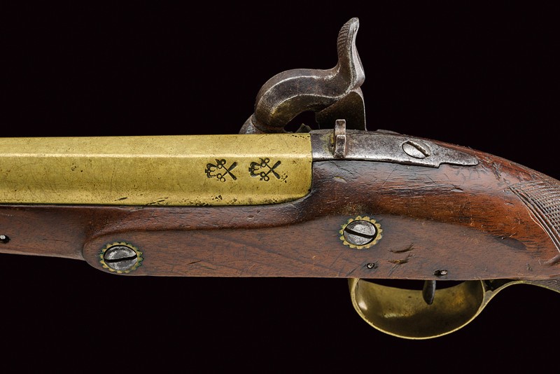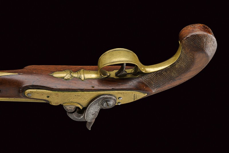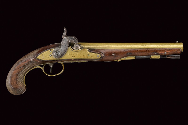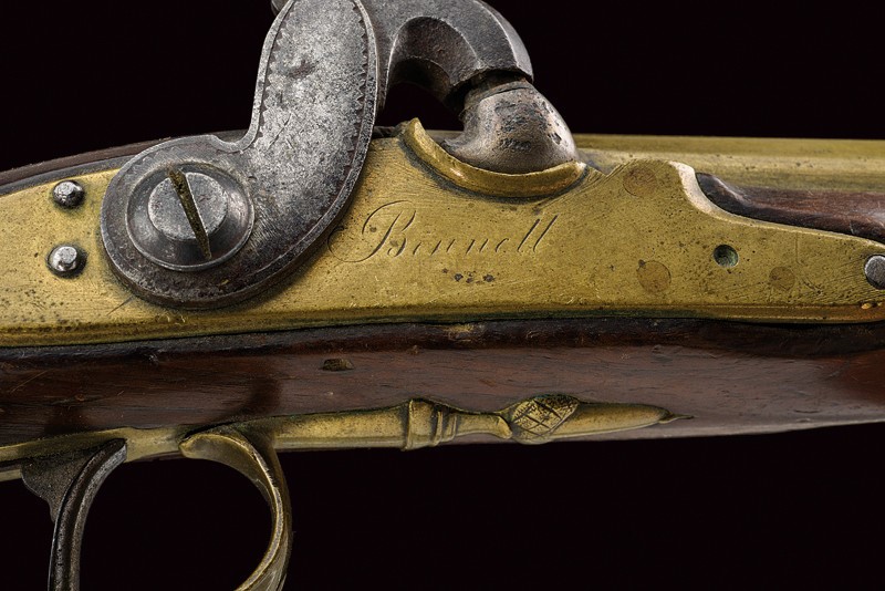 Smooth, round, 13 mm cal. barrel with square base and rib, featuring stamps of the test bench, iron foresight; iron tang with rear sight; brass lock with the plate marked "BENNET", iron hammer with engravings at the border. Wooden full stock with checkered neck, brass mounts, horn-tipped, wooden ramrod with iron cartridge extractor. See "Selected Antique Arms And Armour - The Abildgaard Collection", pp. 230/231 picture N° 7.07 with text.