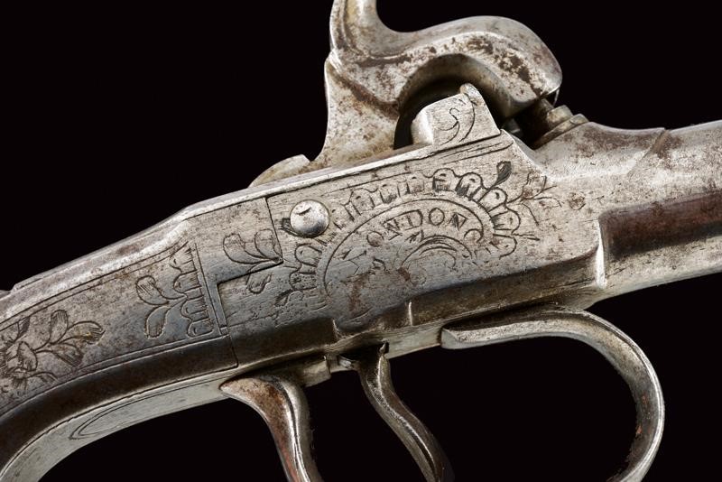 Round, turn-off, 10 mm cal. barrel, rifled in the second part, with moulded nozzle; working mechanisms, converted to percussion. Frame signed "GALISSE" on one side and "LONDON" on the other, iron grips engraved with floral motifs. Trigger guard decorated en suite.