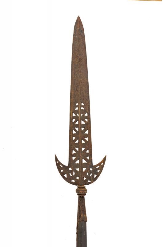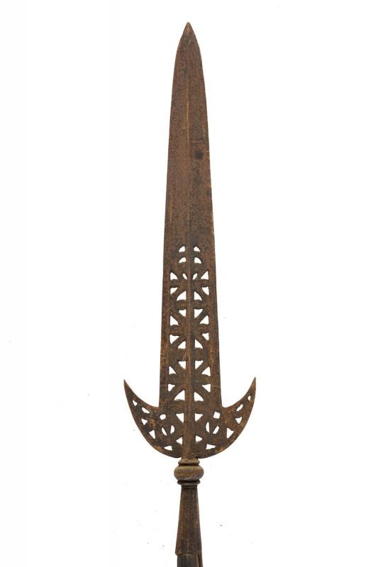 Cusp with blade ribbed at the center, decorated on the lower part with open-works, the wings en suite. Flattened knot, short ferrule with only a single strap. Later wooden shaft, not of recent production. In antique patina.