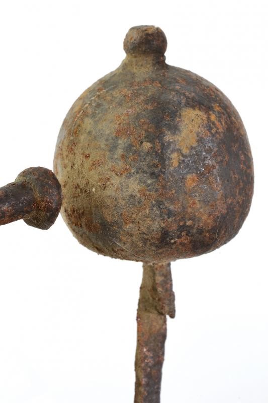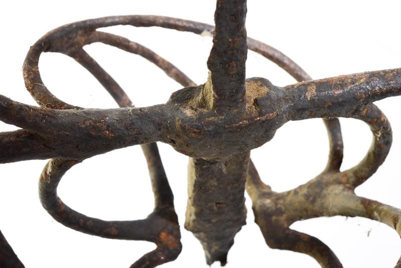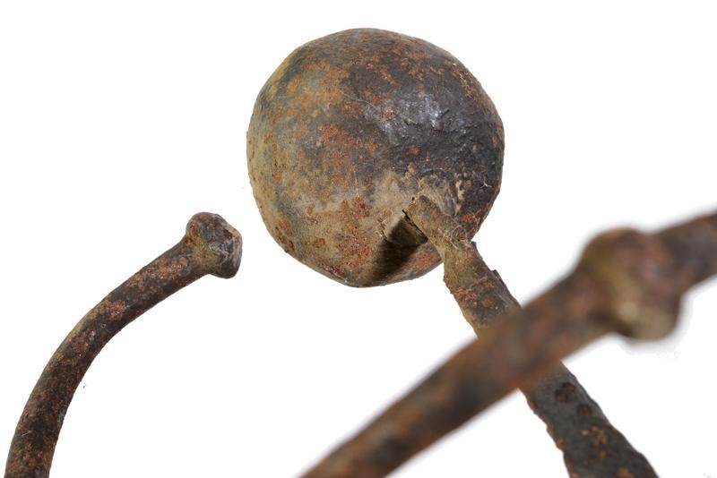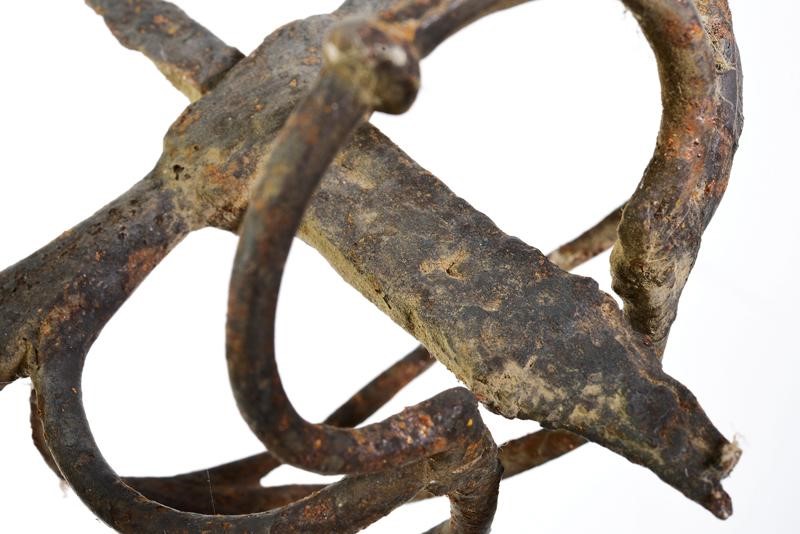 The ricasso of the blade still present. Iron hilt. Quillon with counter-curved quillons and cusped button-shaped ends. Guard with two loop-guards decorated with knots. The arms of the hilt with trigger guard decorated en suite. The rear part with three loo-guards connecting a small arch with the base of front quillon. Spheroid, facetted and buttoned pommel. In antique patina.