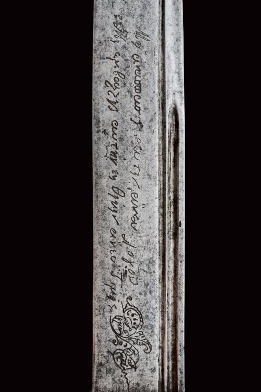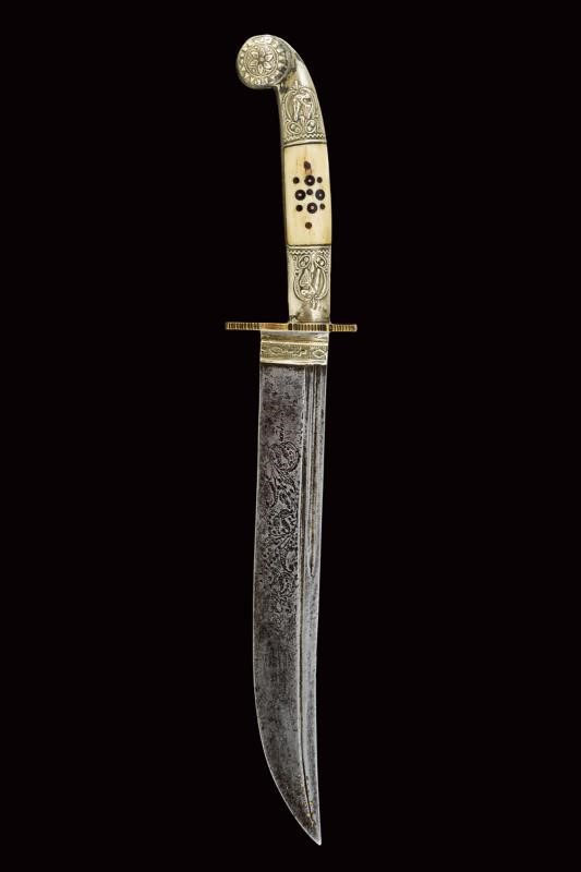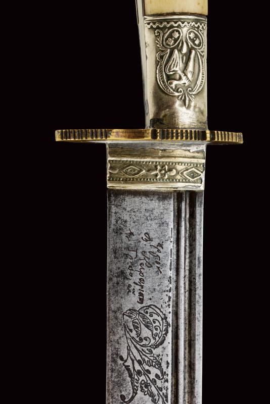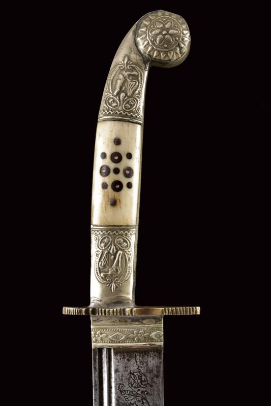 Straight, single-and-false-edged edged blade with raised tip and double groove near the back. On both sides inscriptions (Greek characters?) and floral motifs. Metal-foiled tang decorated with floral motifs. Brass quillon with carved edge and small grooves. Grip with horn grip scales decorated with inlays and white metal-foiled mounts embossed and engraved with birds, angled pommel shaped as a disc and engraved with floral motifs.